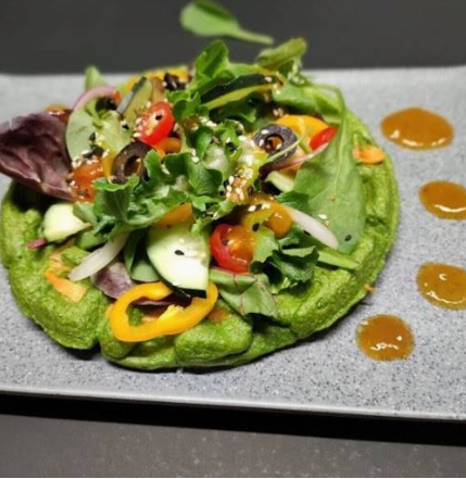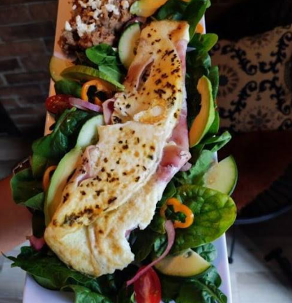 Mezcla de aguacate con espinacas, acompañados con una ensalada salada, aguacate, pimiento y cebolla, más una salsa sorpresa. Calorías: 407.2 kcal carboh: 22.87 g prot: 18.77 g