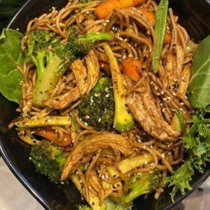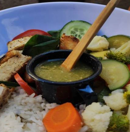 Mezcla de verduras y carne de pollo, acompañado con una porción de arroz y salsa tatemada. Calorías: 302 kcal Carboh: 58 g Prot: 37 g.