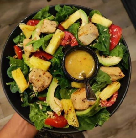 Lechuga orejona como base, acompañada de trozos de piña natural a la parrilla, aguacate, jitomate cherry y pollo a la plancha, con una pequeña porción de coco horneado. Calorías: 189 kcal carboh: 17 g prot: 46 g sopas.