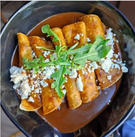 Tortillas tipo flautas, rellenas de pollo deshebrado, bañadas en dos salsas, con una superficie de espinacas, aguacate y queso ranchero. Calorías: 477 kcal Carboh: 58.78 g Prot: 37.25 g.