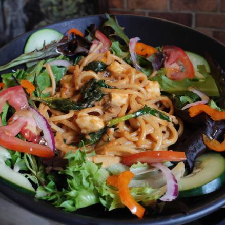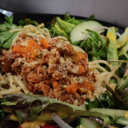 Pasta bañada en aceite de oliva, como superficie, una mezcla de salsa de jitomate y ajo, con trozos de carne de res y zanahoria, albahaca para degustar, montada en una ensalada de hojas verdes con cherry y pepino.