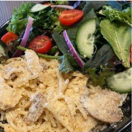 Mezcla cremosa con champiñones, revuelta de queso panela, ranchero, parmesano y manchego, acompañada de una ensalada agridulce con pepino, pimiento, cebolla y lechuga italiana. Calorías: 450 kcal carboh: 50.26 g prot: 18.5 g.
