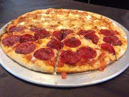 Pizza con salsa de tomate, queso, pepperoni, salsa catsup.