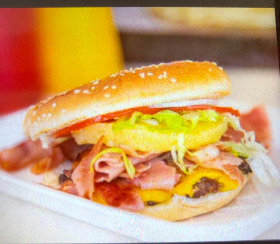 Doble carne a la parrilla con dos quesos, tocino y jamón.