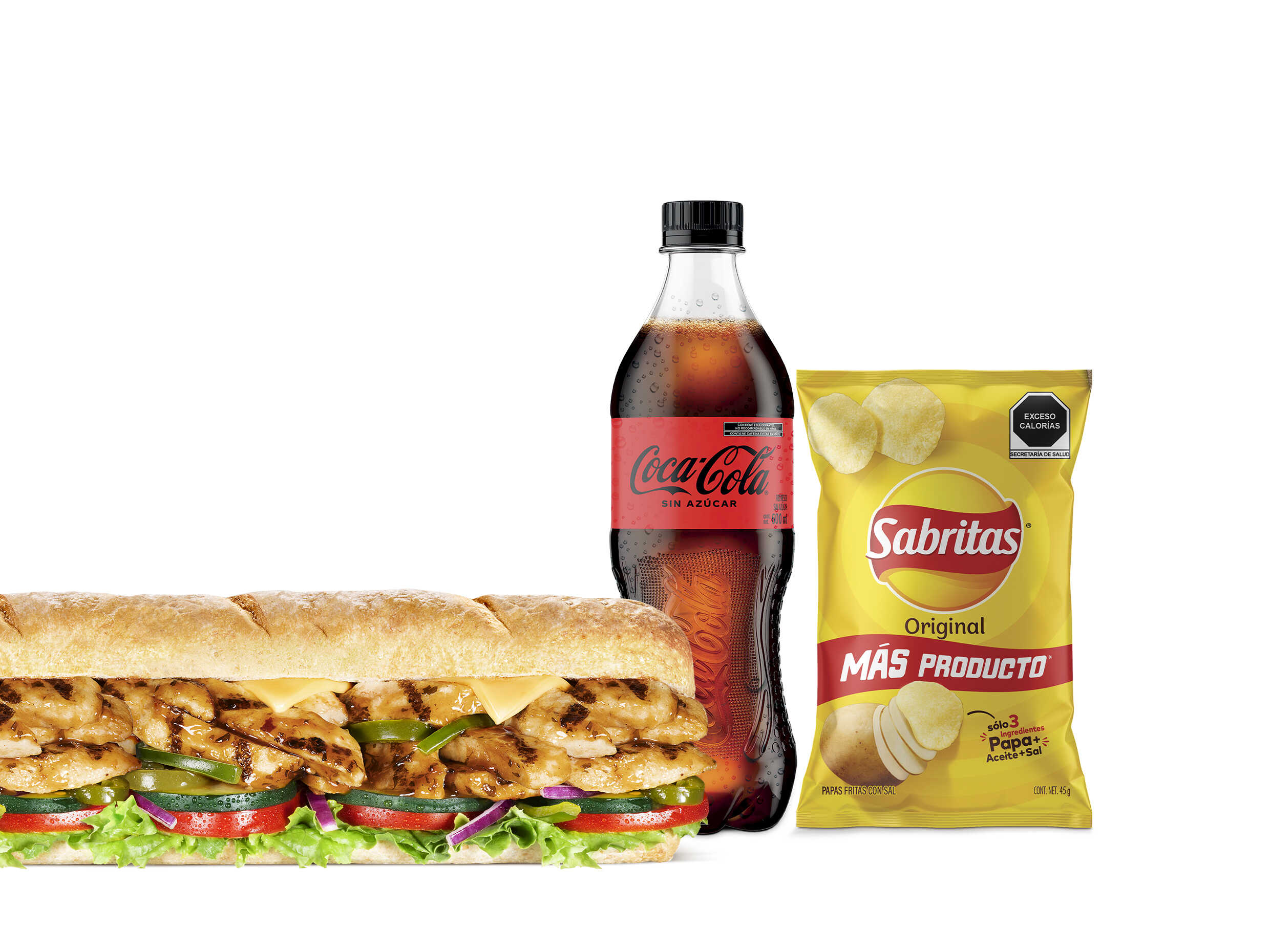 Pan integral con tiras de pechuga de pollo estilo teriyaki, doble porción de queso americano, cebollitas crujientes, lechuga, jitomates, pimientos verdes y aderezo de cebolla dulce, más papas o galleta y bebida.