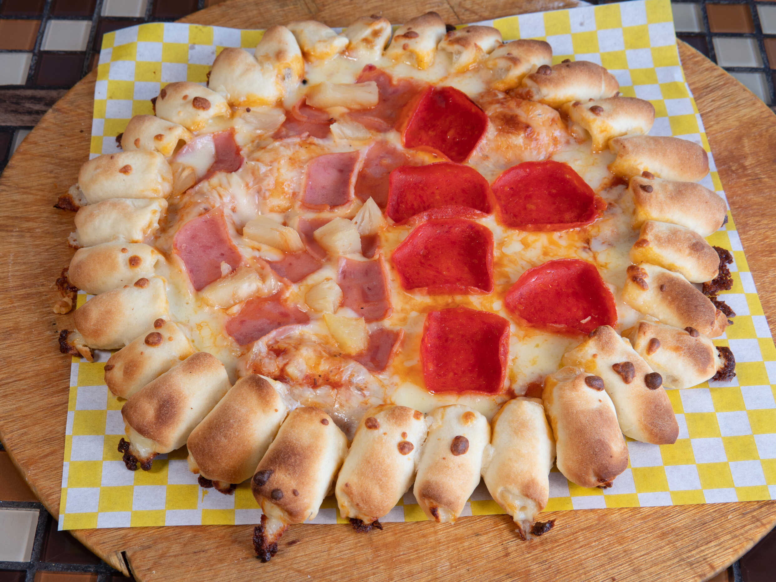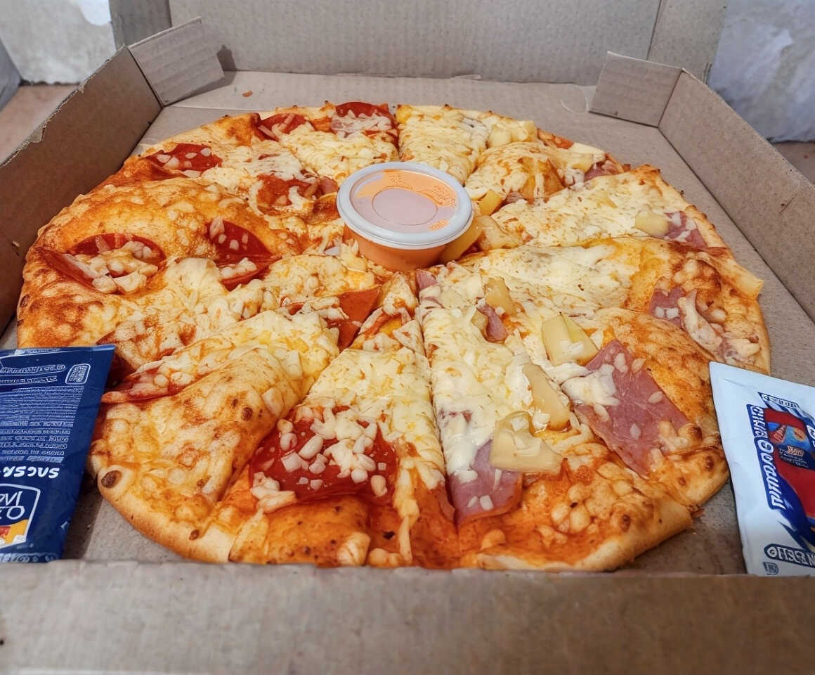 (35cm dividida en 8 porciones) 1 Pizza familiar mitad hawaiana mitad pepperoni. Incluye 2oz de chimichurri y 3 sobrecitos de cátsup.