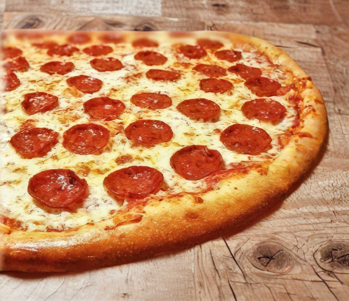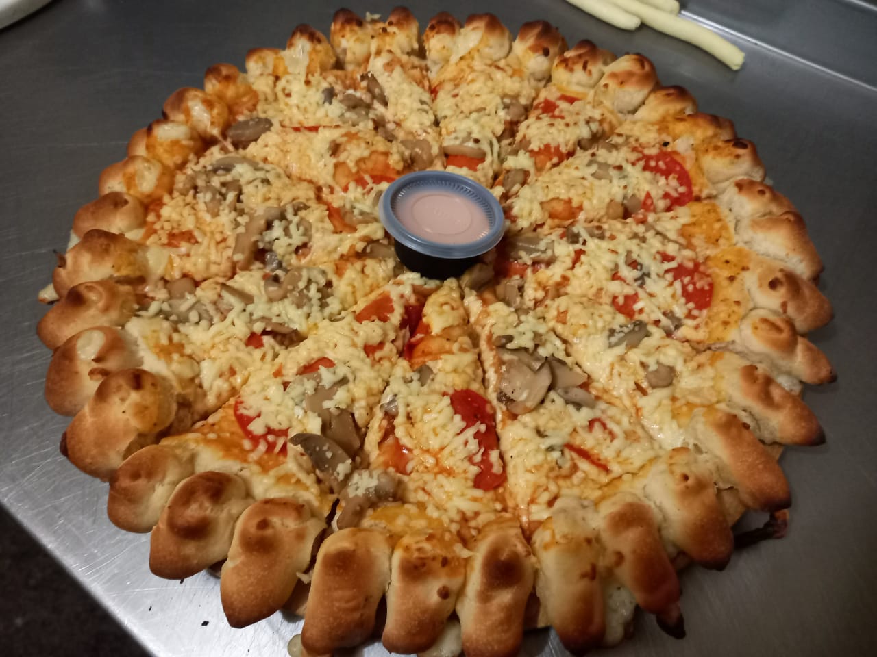Pizza con Orilla de Queso, 12 rebanadas, 2 ingredientes (16"). Incluye 2 oz de chimichurri y 3 sobrecitos de cátsup.