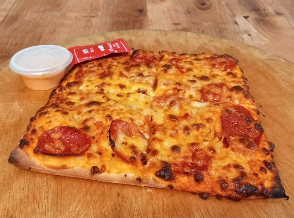(25 cm dividida en 8 Rebanadas), 2 ingredientes . Incluye 2 oz de chimichurri y 3 sobrecitos de cátsup. de 2 a 3 personas.