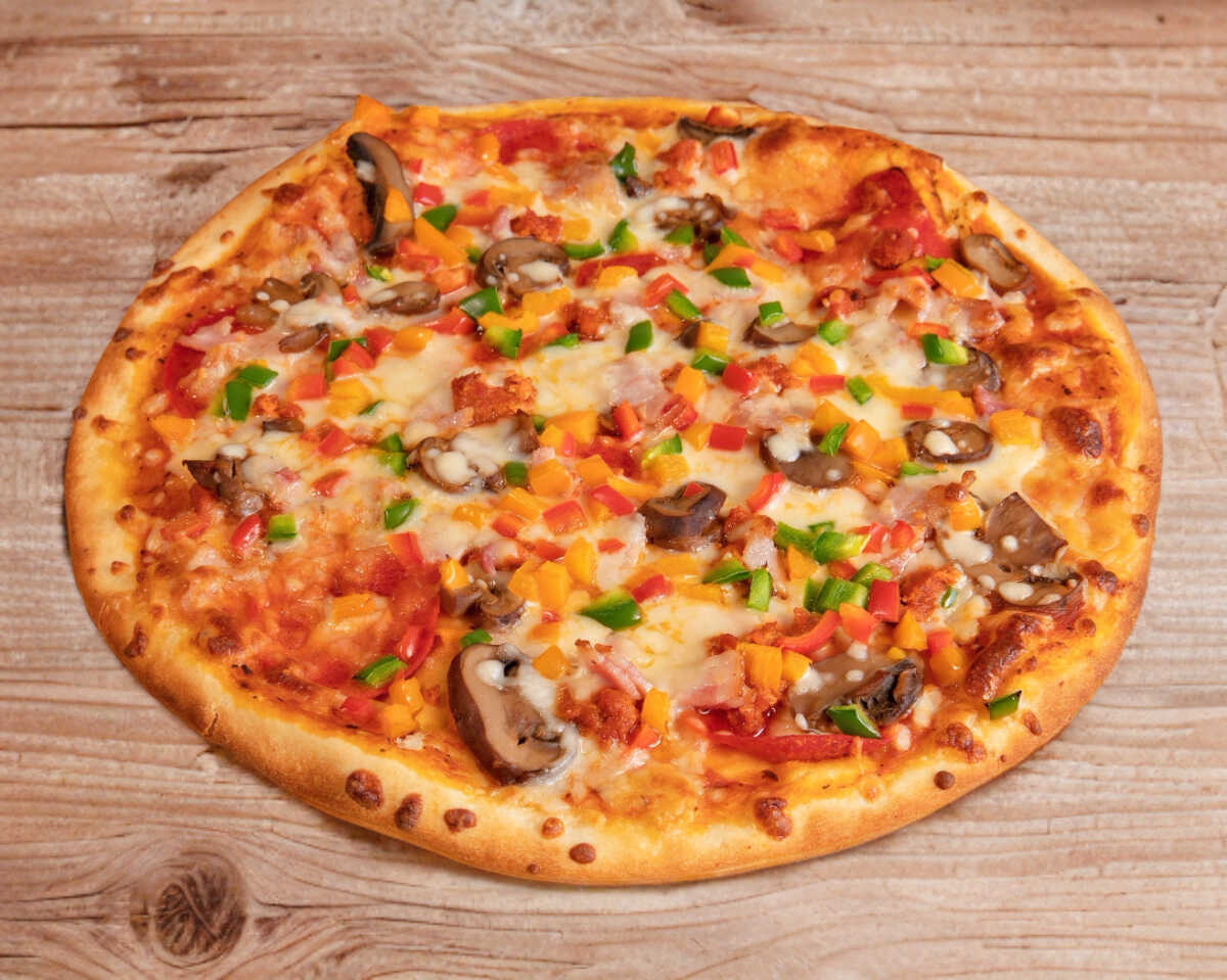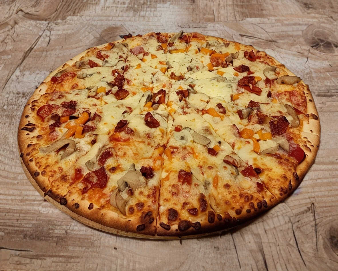 8 Rebanadas (14"), Especialidad. (Pepperoni, pastor, champiñones, tocino, pimiento morrón). Incluye 2 oz de chimichurri y 3 sobrecitos de cátsup.