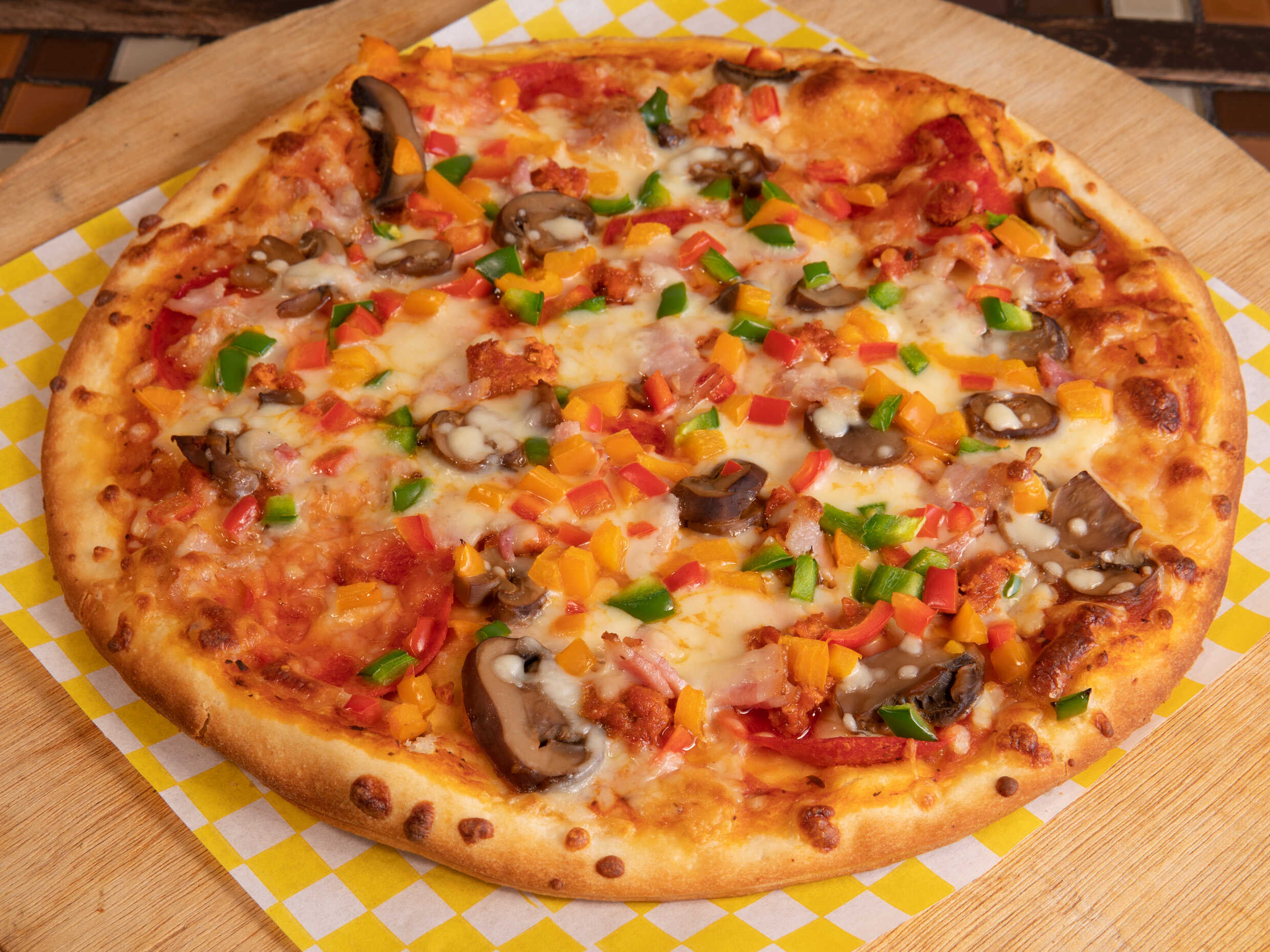 16 rebanadas (18"), especialidad. (Pepperoni, pastor, champiñones, tocino, pimiento morrón). Incluye 2 oz de chimichurri y 3 sobrecitos de cátsup.