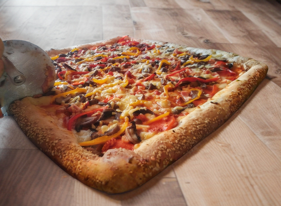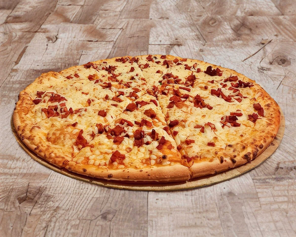 Pizza de 45cm - 12 Rebanadas, 2 ingredientes; Incluye 2 oz de chimichurri y 3 sobrecitos de cátsup. (Tamaño mega "mas grande que la familiar) de 4 a 5 personas