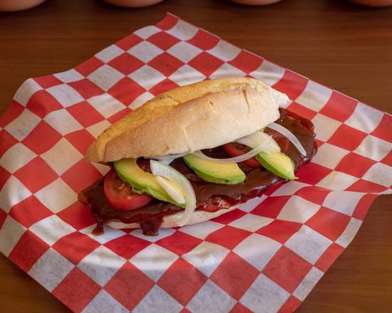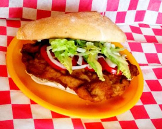 Exquisita milanesa de cerdo, mayonesa, aguacate, jitomate, cebolla y lechuga.