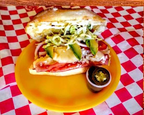 Exquisito lomo de cerdo, jamón, queso amarillo, queso asadero, aguacate, jitomate, cebolla y lechuga.