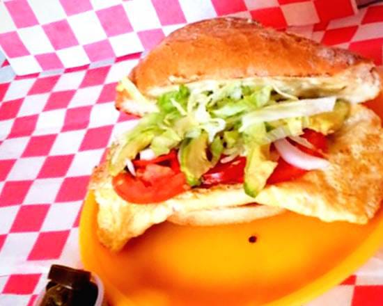 Huevo con exquisito chorizo, mayonesa, aguacate, jitomate, cebolla y lechuga.