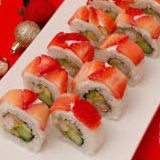 Rollo cubierto de fresa por dentro camarón, aguacate y philadelphia