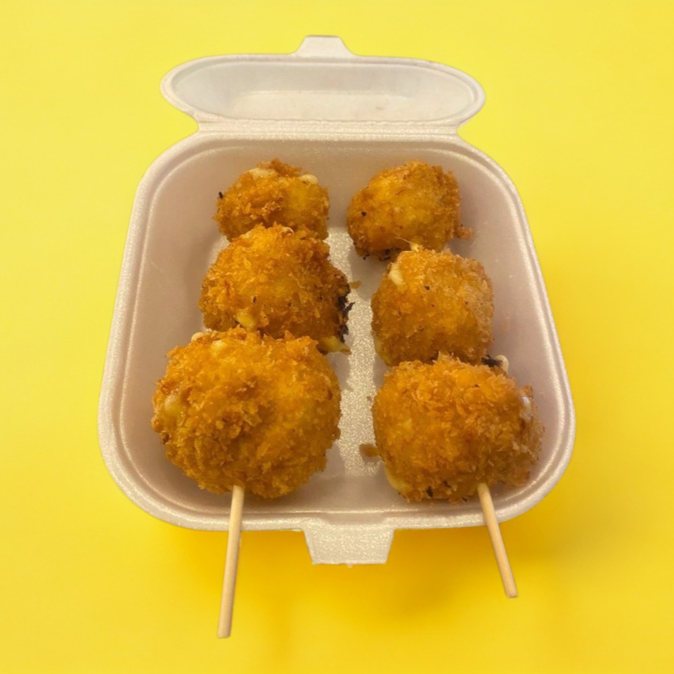 Producto individual: Kushiages de queso (6 piezas), cubos de queso empanizados acompañados con salsa teriyaki o salsa chipotle.