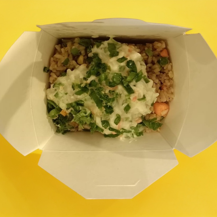 Arroz sazonado con salsa de soya acompañado de pollo, Tampico, cebollín, kushiages de queso,y chile toreado
