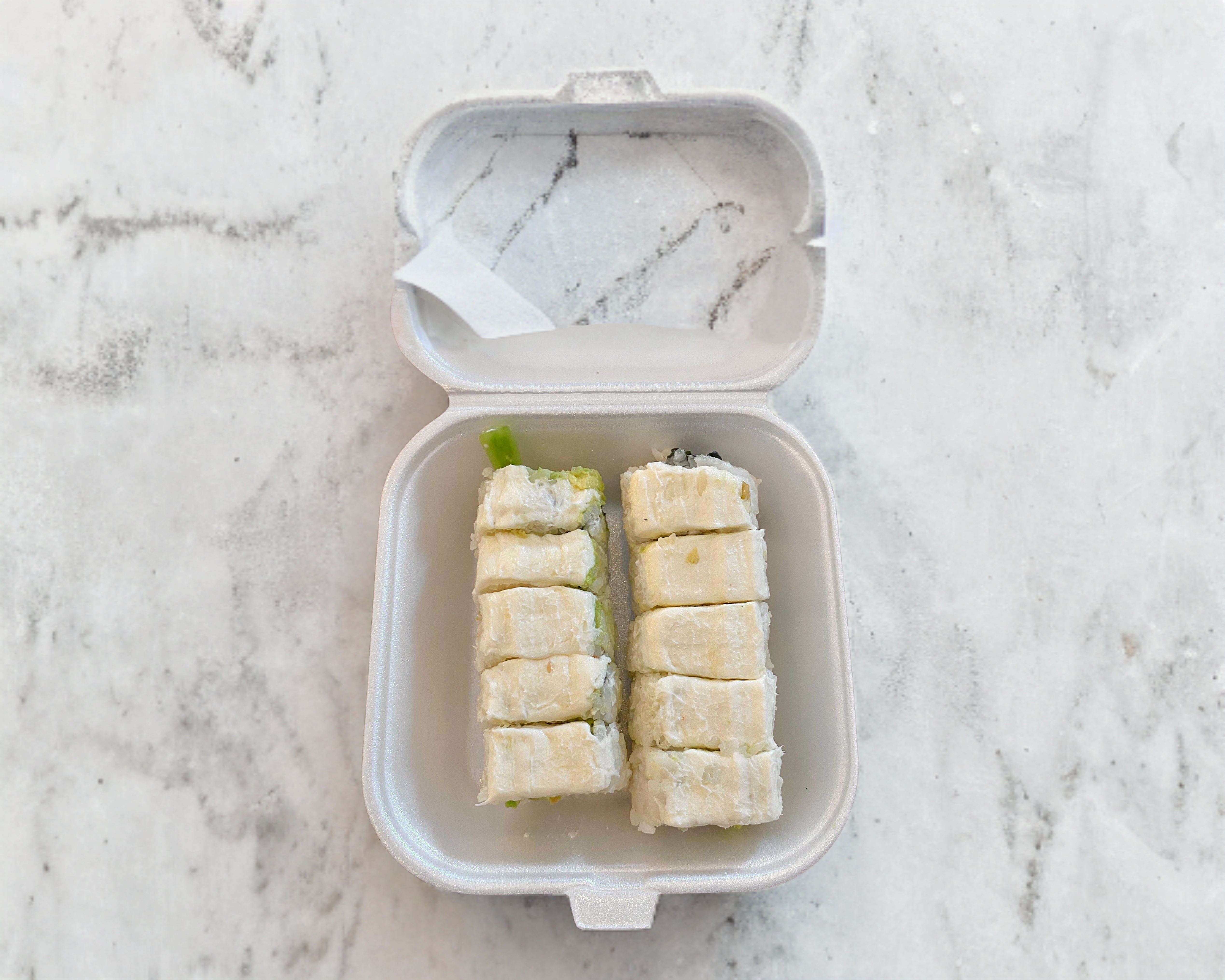 Producto individual, aproximadamente 10 bocados empanizados por dentro, rellenos de Philadelphia, aguacate y pepino.