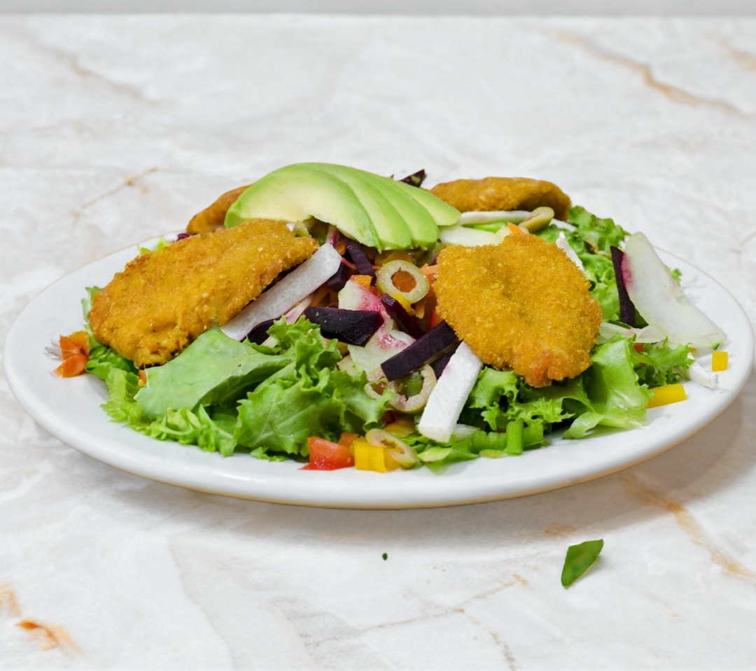 Pescado empanizado, aguacate, arroz frito, lechuga.