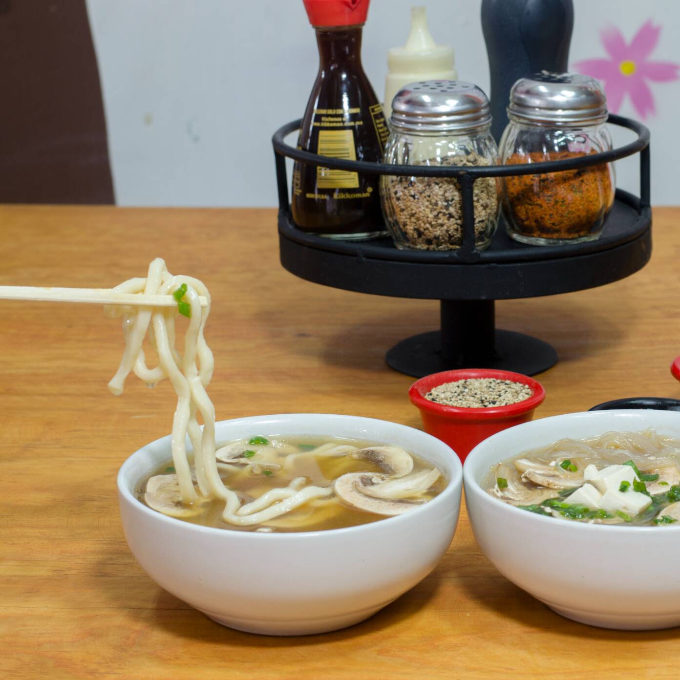 Pasta chuka soba, con huevo duro,1pz de camarón capeado, res, alga, tofu, cebollín, champiñón en caldo de miso.