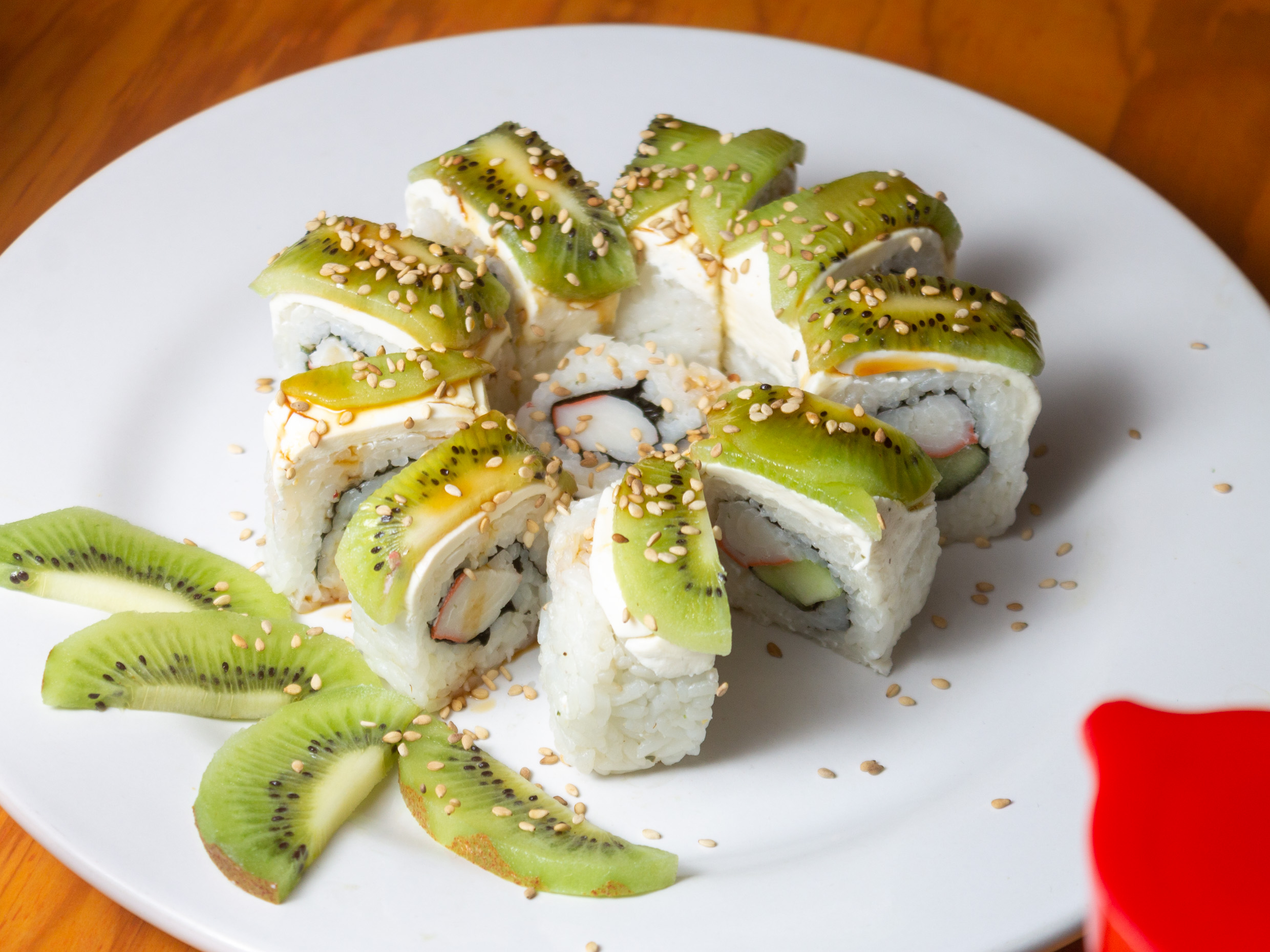 Exquisito kiwi, queso crema, cangrejo, pepino y salsa de anguila.