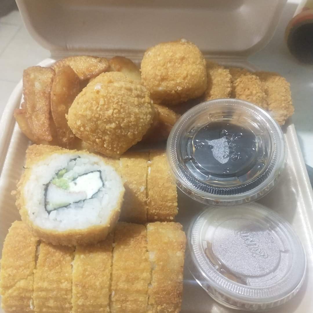 1 MAKI EMPANIZADO SURIMI QUESO Y AGUACATE, 1 ORDEN PERSONAL DE PAPAS, 2 ROCHETAS DE QUESO Y 4 AROS DE CEOBOLLA