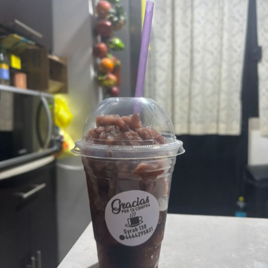 Frappe con Moka , decorado con chocolate liquido, chispas de chocolate y crema batida