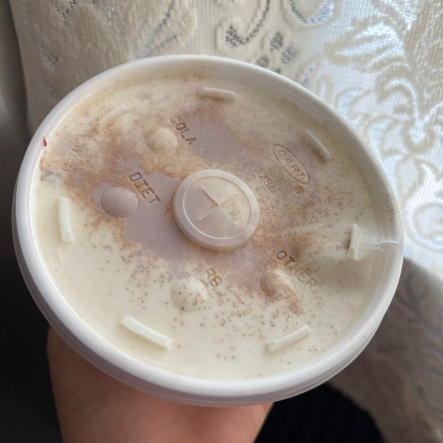 Frappe con rompope, decorado con chocolate liquido, chispas de chocolate, crema batida y galleta de decoracion
