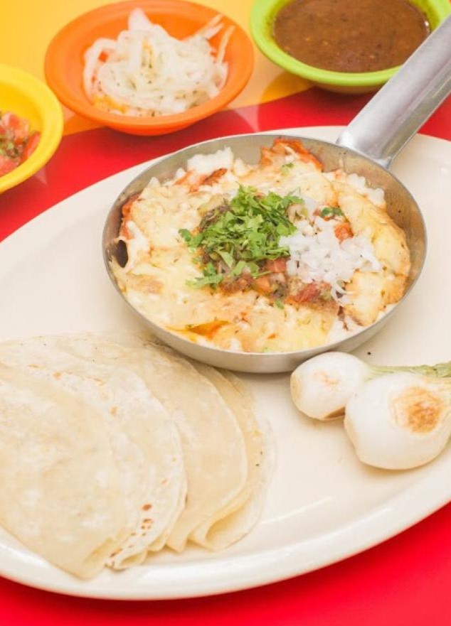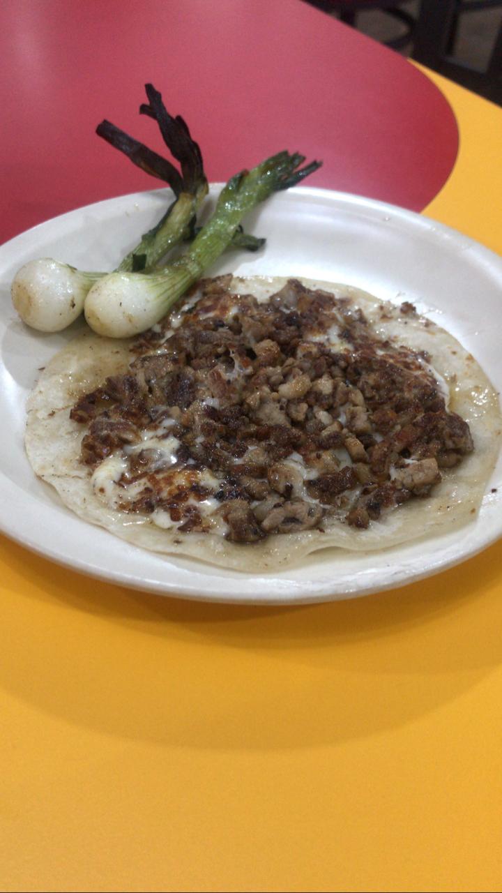 Acompañada de frijoles, chorizo guacamole y cebollita asadas.