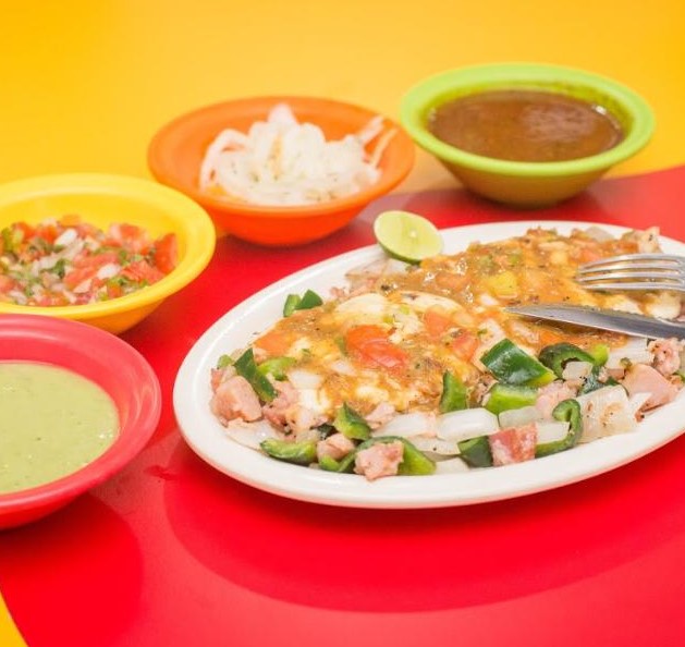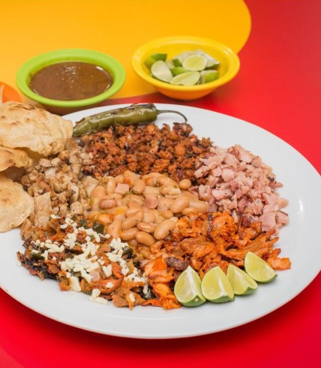 Acompañada de nuestros tradicionales frijolitos charros, chuleta, bistec, chorizo, carne al pastor y alambre.