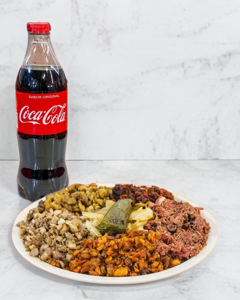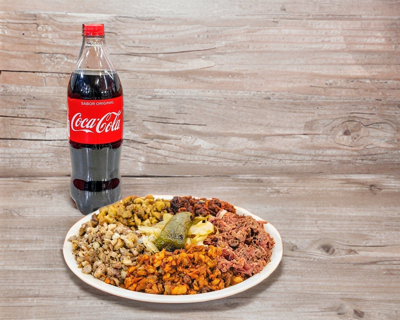 Parrillada #2 (cecina, arrachera y barbacoa) con tortillas, cebolla asada, chiles toreados, salsas e incluye refresco Coca-Cola de 2 lts. que puede variar según disponibilidad.