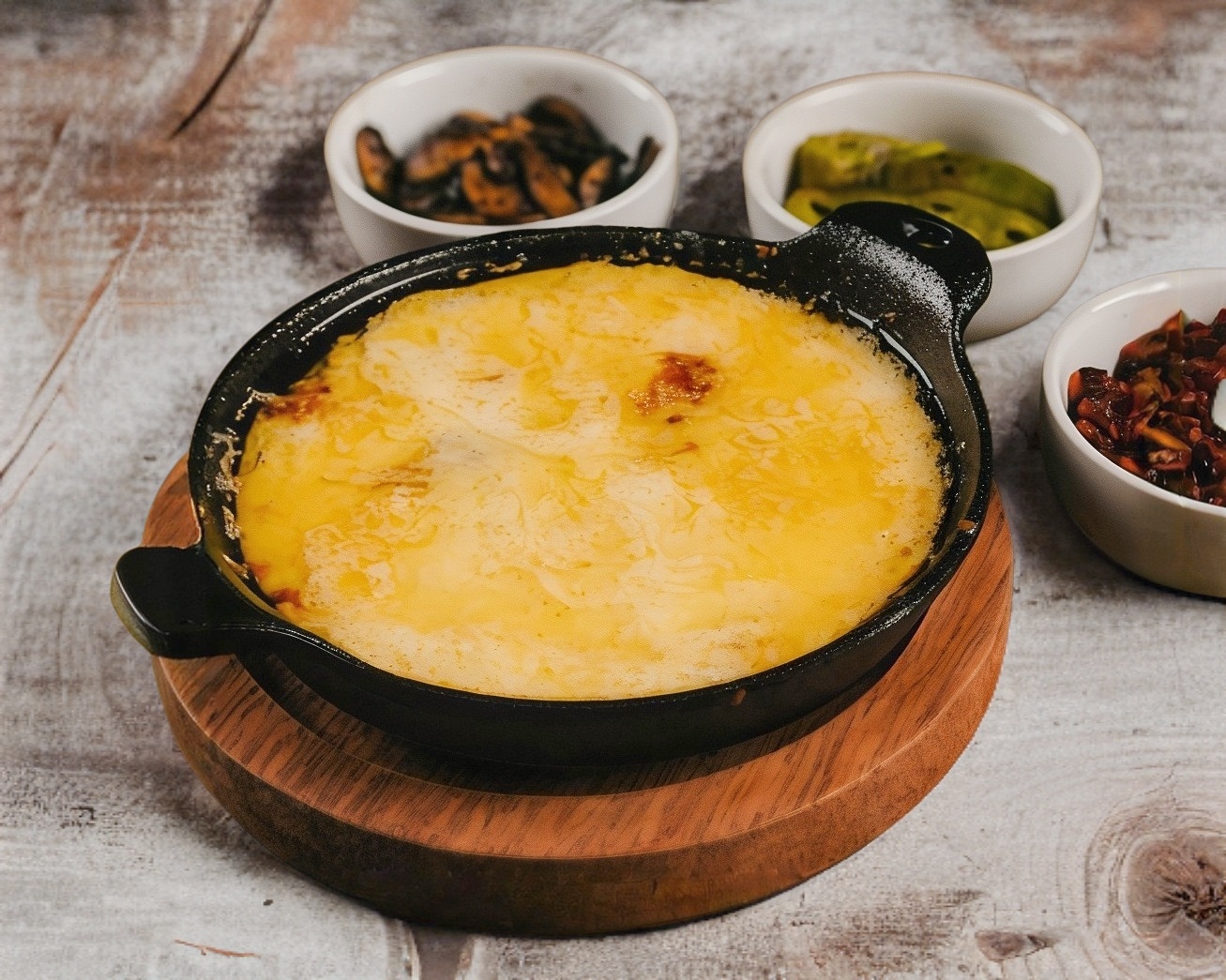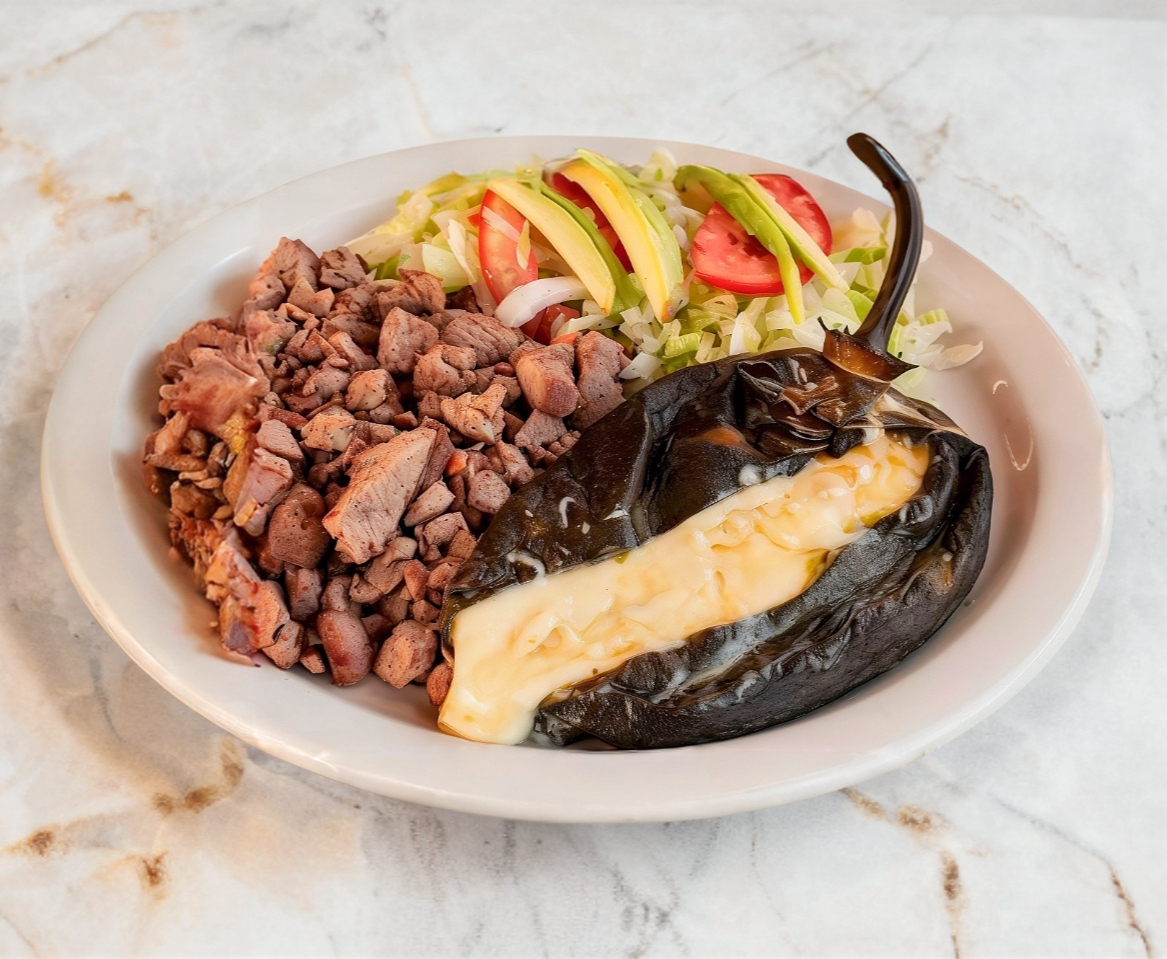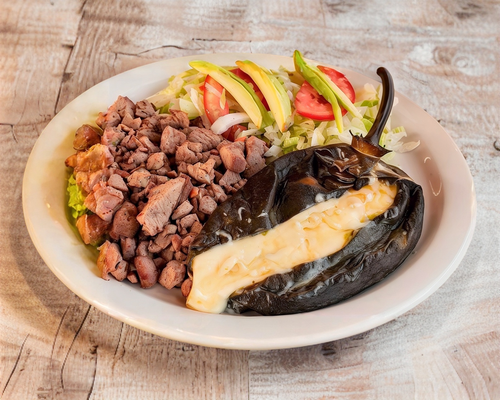 Bistec, pastor y chorizo. Combinación de carnes con chile poblano, cebolla, tocino, piña y queso. Se incluye tortillas, salsa roja, salsa aguacate y salsa jalapeño, cilantro y cebolla, limones, cebolla cocida y chile toreado.