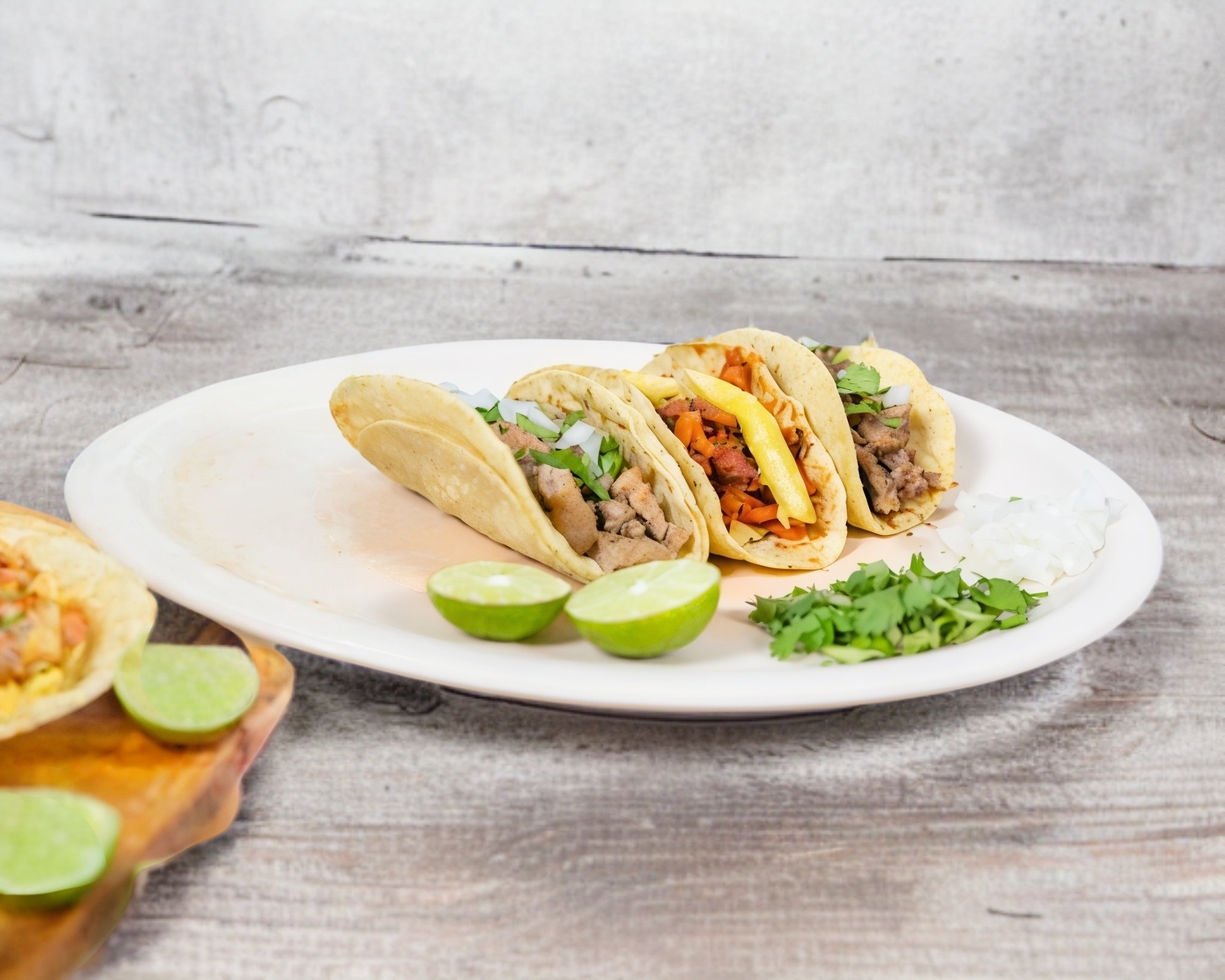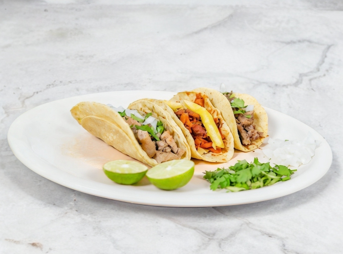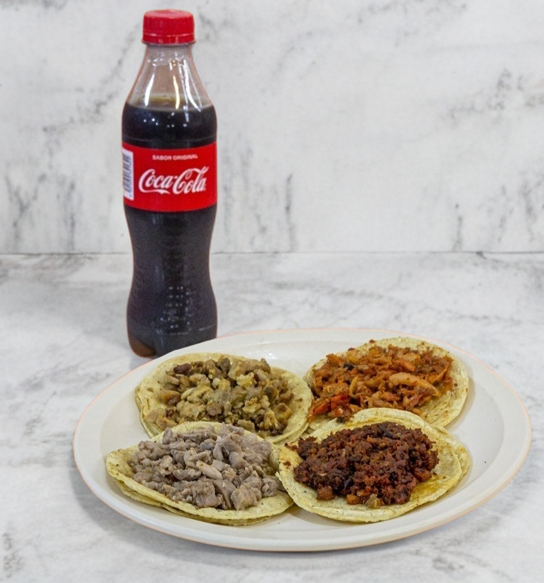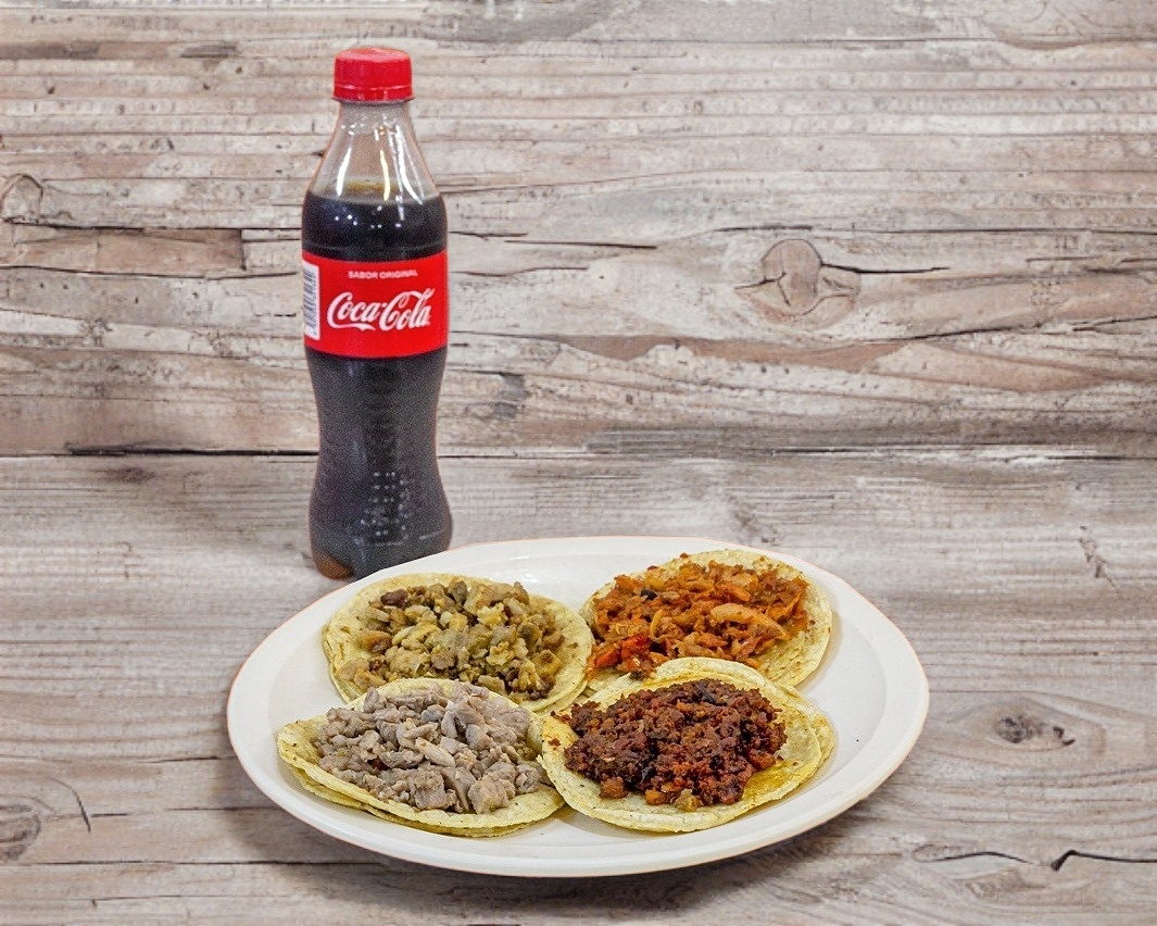 4 Tacos (bistec, pastor, machito o chorizo). Incluye refresco de 355 ml. que puede variar según disponibilidad.