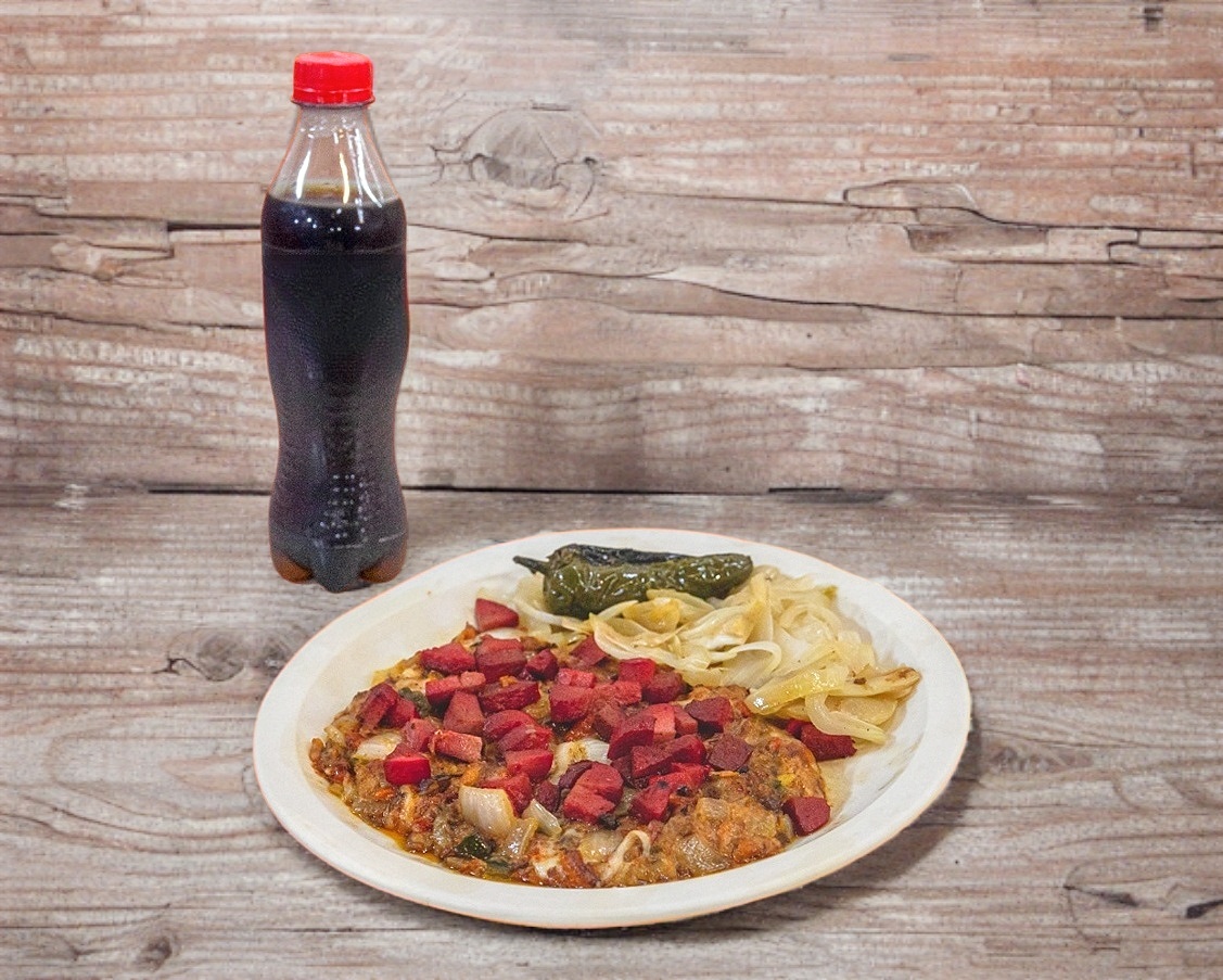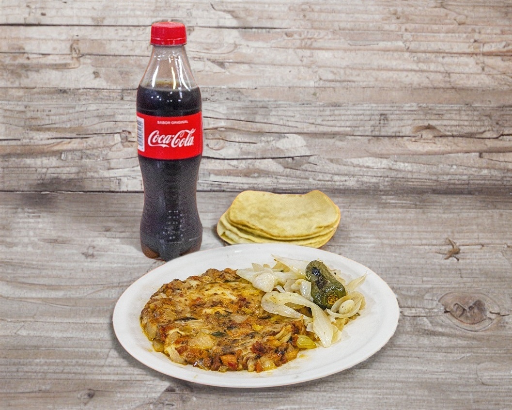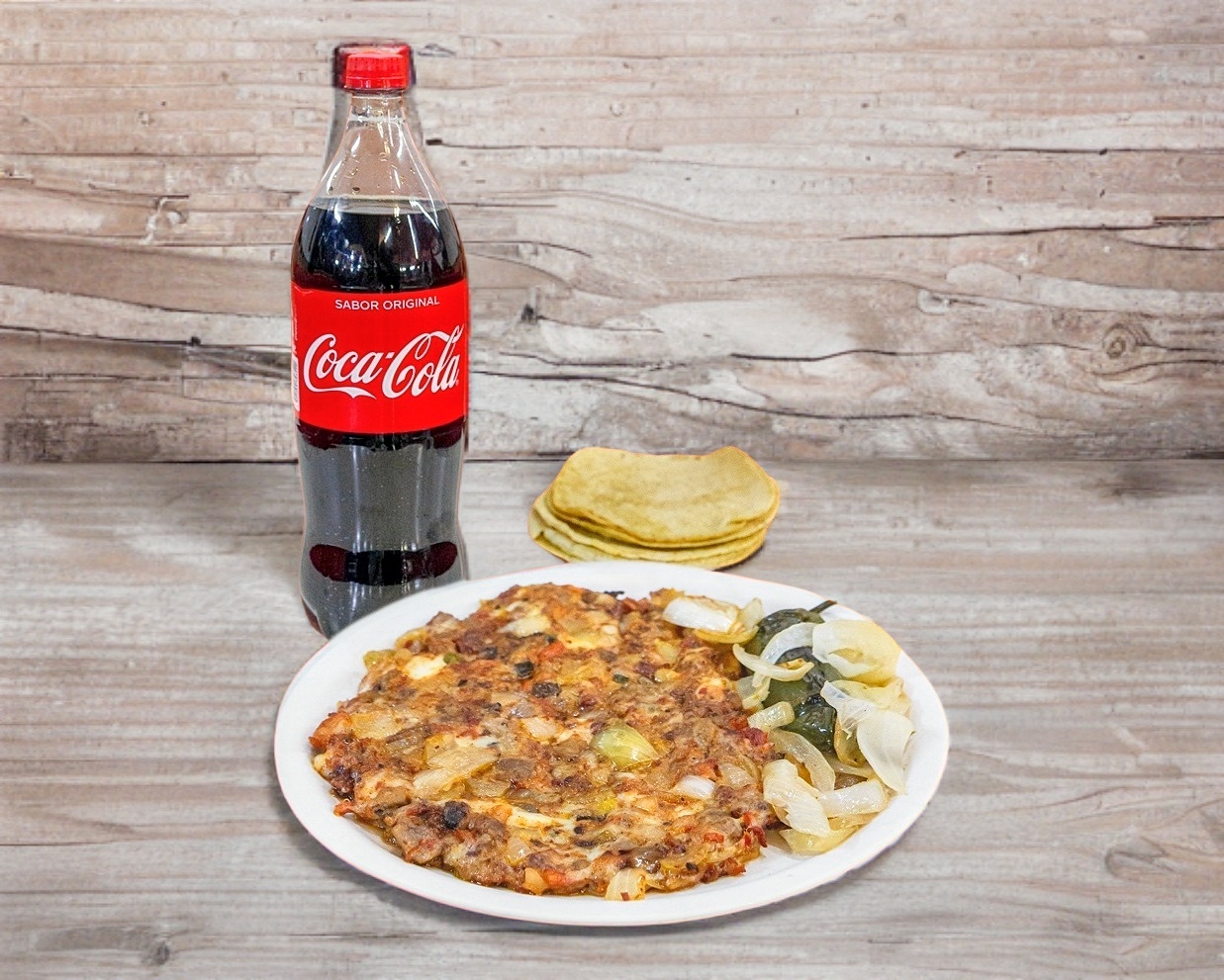Puedes elegir alambre, bistec o pastor. Incluye tortillas, salsa y refresco de 355 ml. que puede variar según disponibilidad.