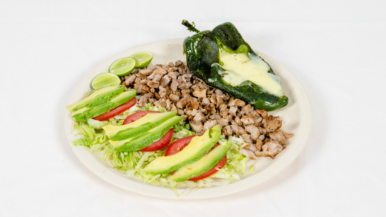 Parrillada #2 (cecina, arrachera y barbacoa) con tortillas, cebolla asada, chiles toreados, salsas e incluye refresco de 2 lts. que puede variar según disponibilidad.