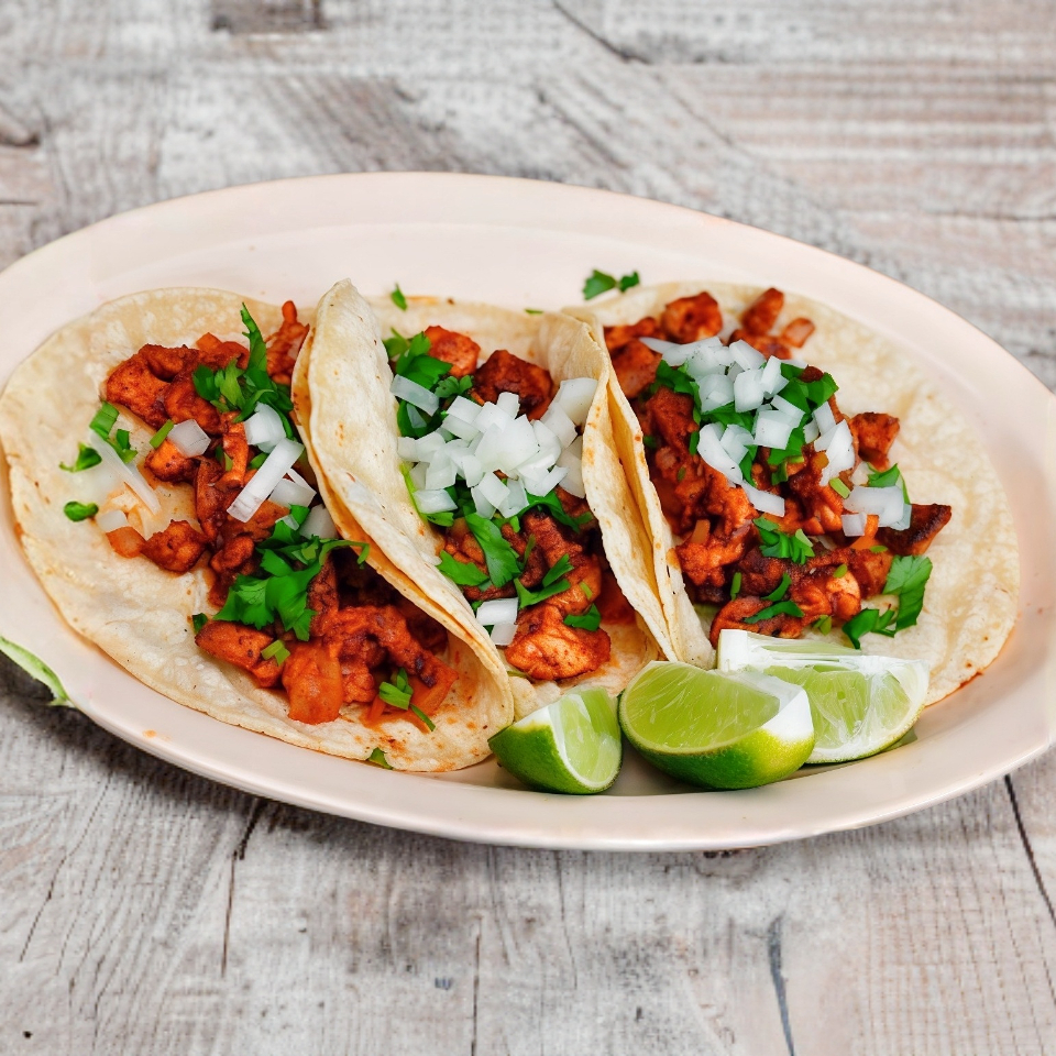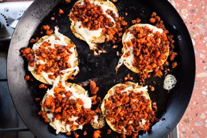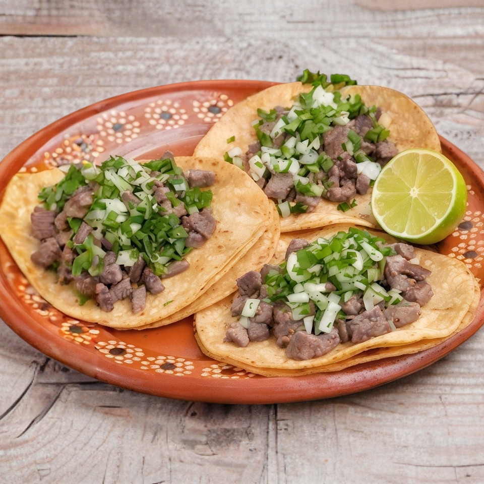 Tostada de maíz, queso, bistec, chorizo, chile güero.