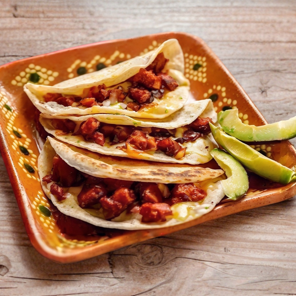 Quesadilla de harina con bistec, chorizo, chile güero y queso.