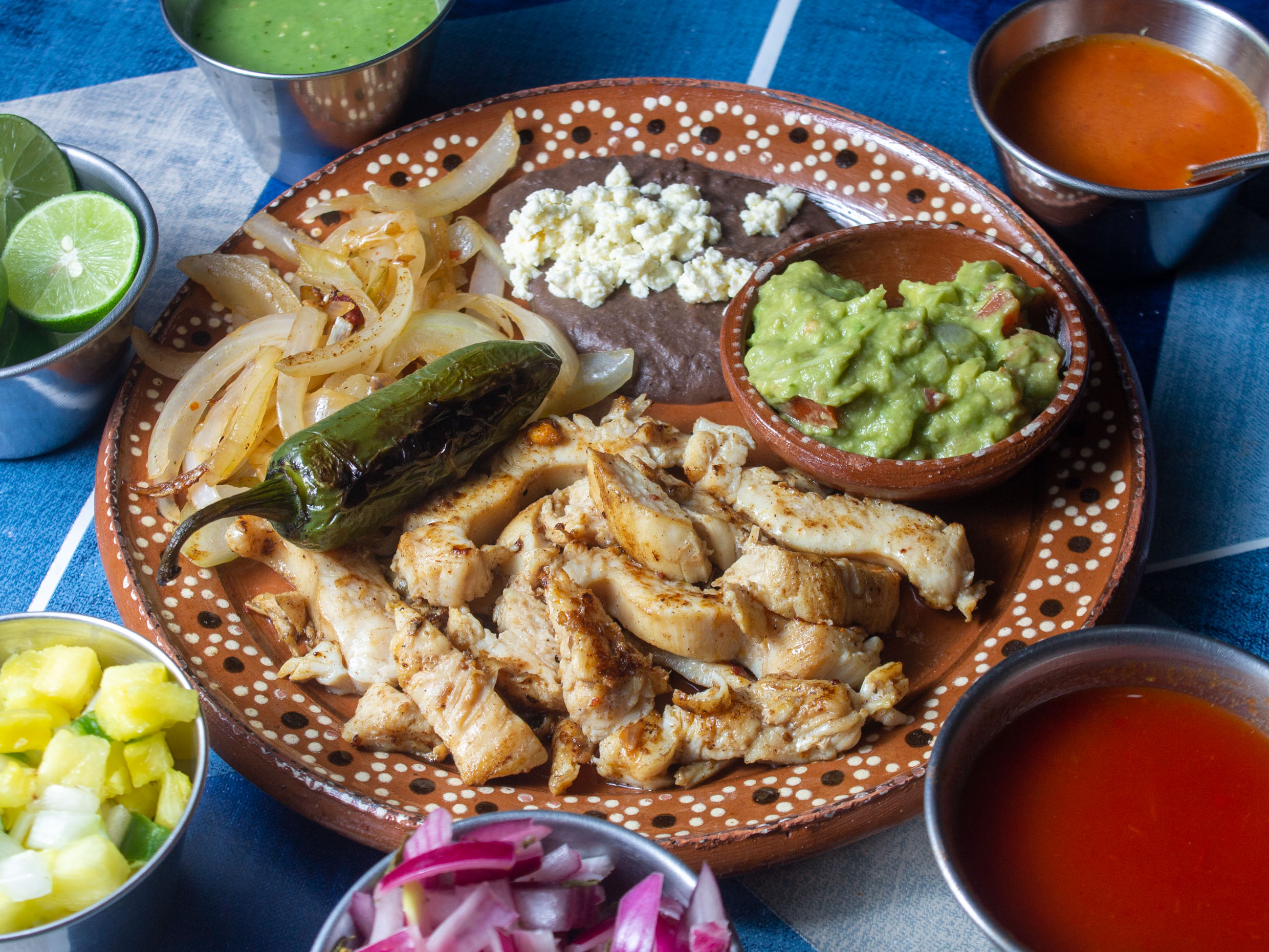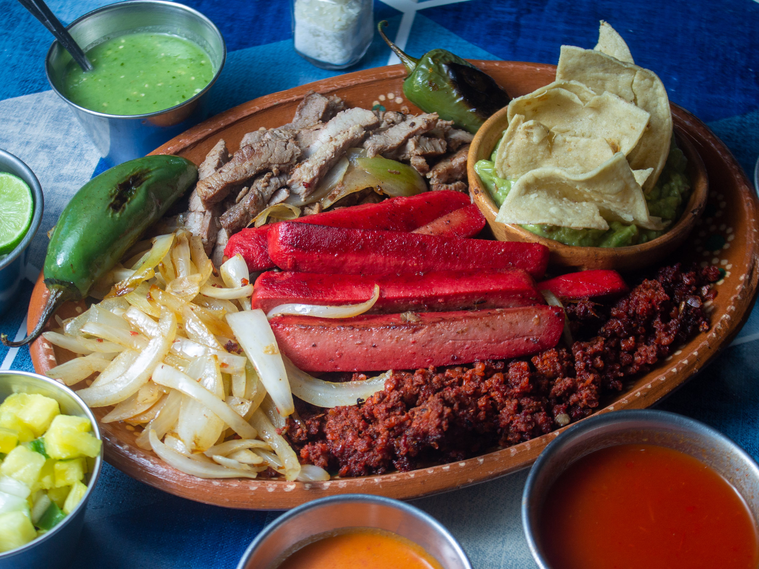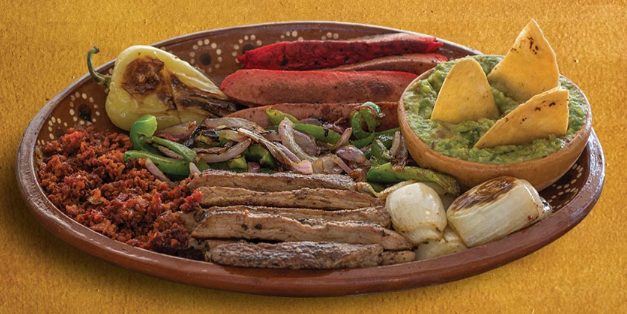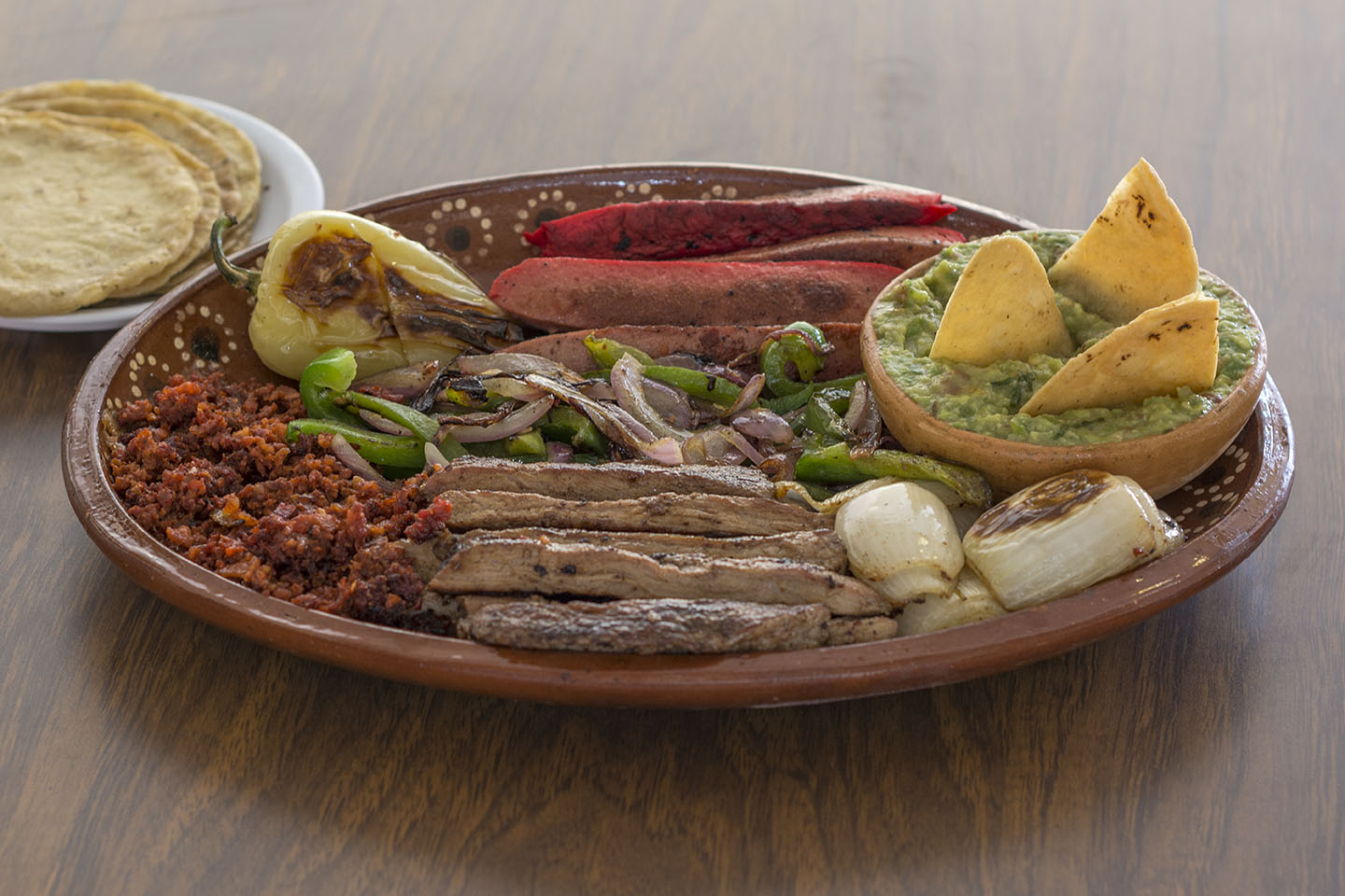 Arrachera, Salchichón, guacamole, cebolla asada, chiles toreados, chorizo.