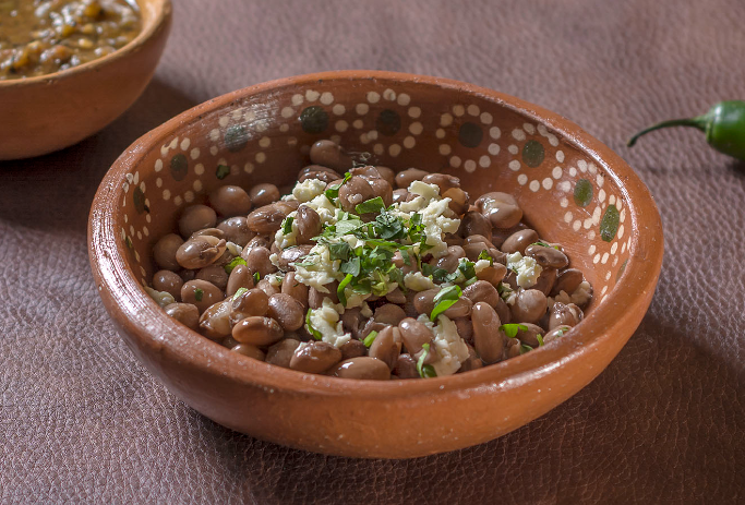 Tradicionales frijoles de la olla preparados con chorizo, salchicha, jamón, jitomate y mucha