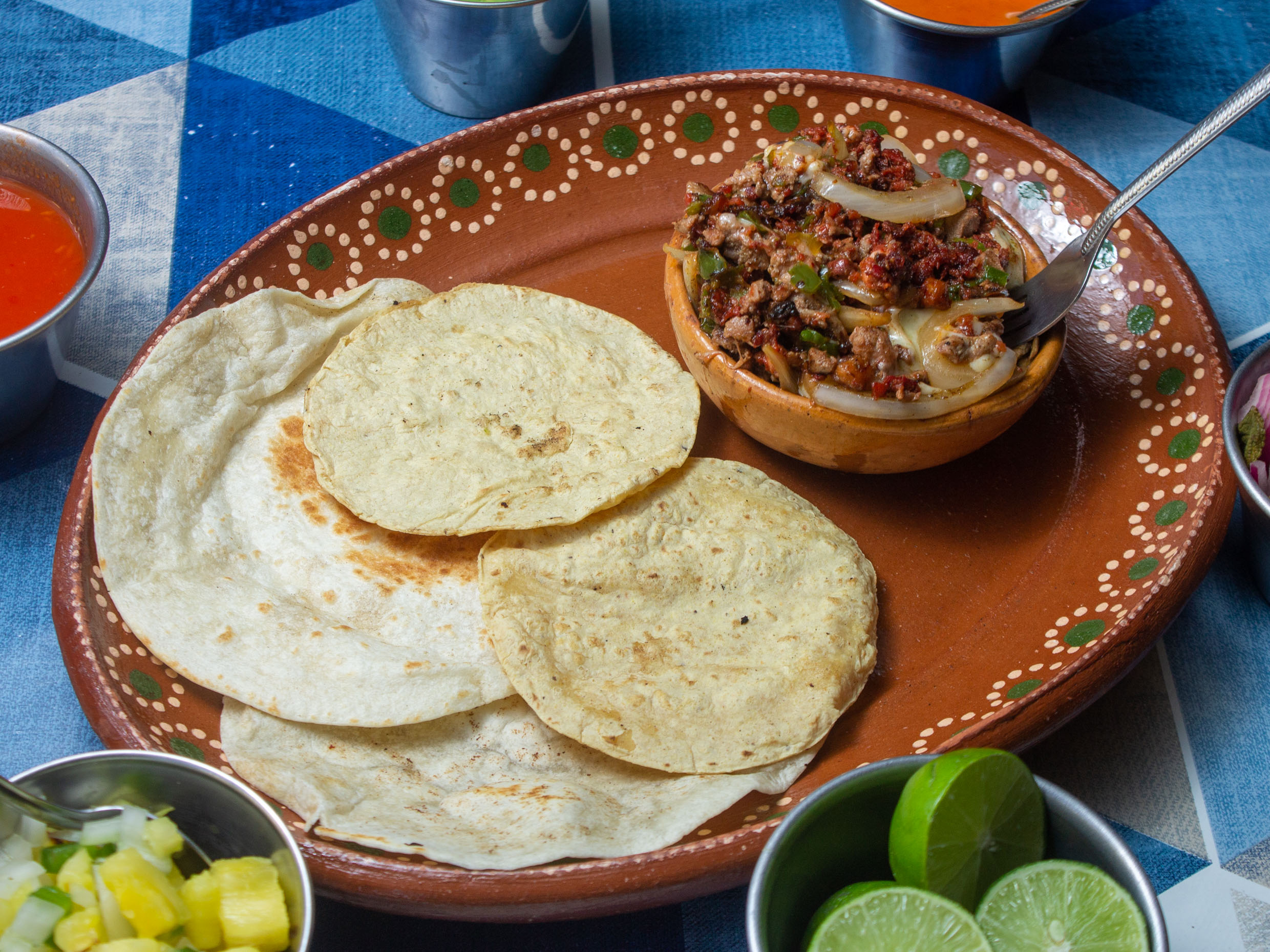 Cuarto de carne preparada, salsas, verdura, tortillas de harina, maíz, chiles, cebollas asadas