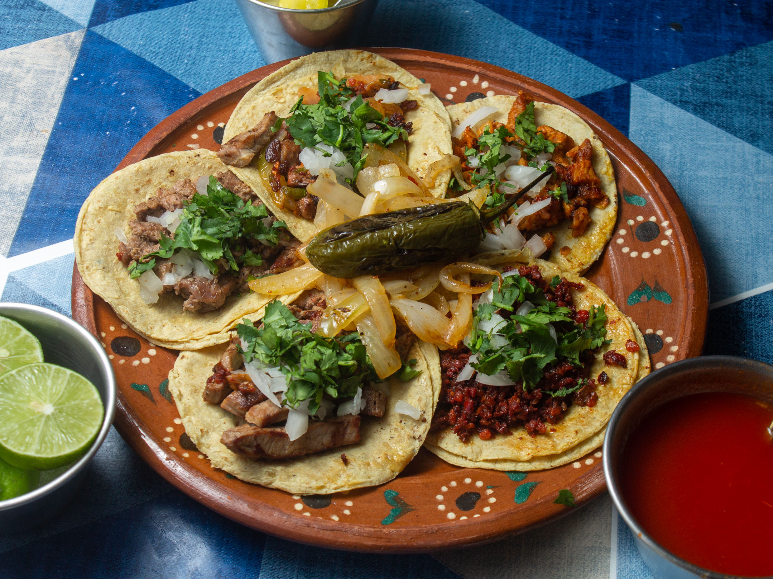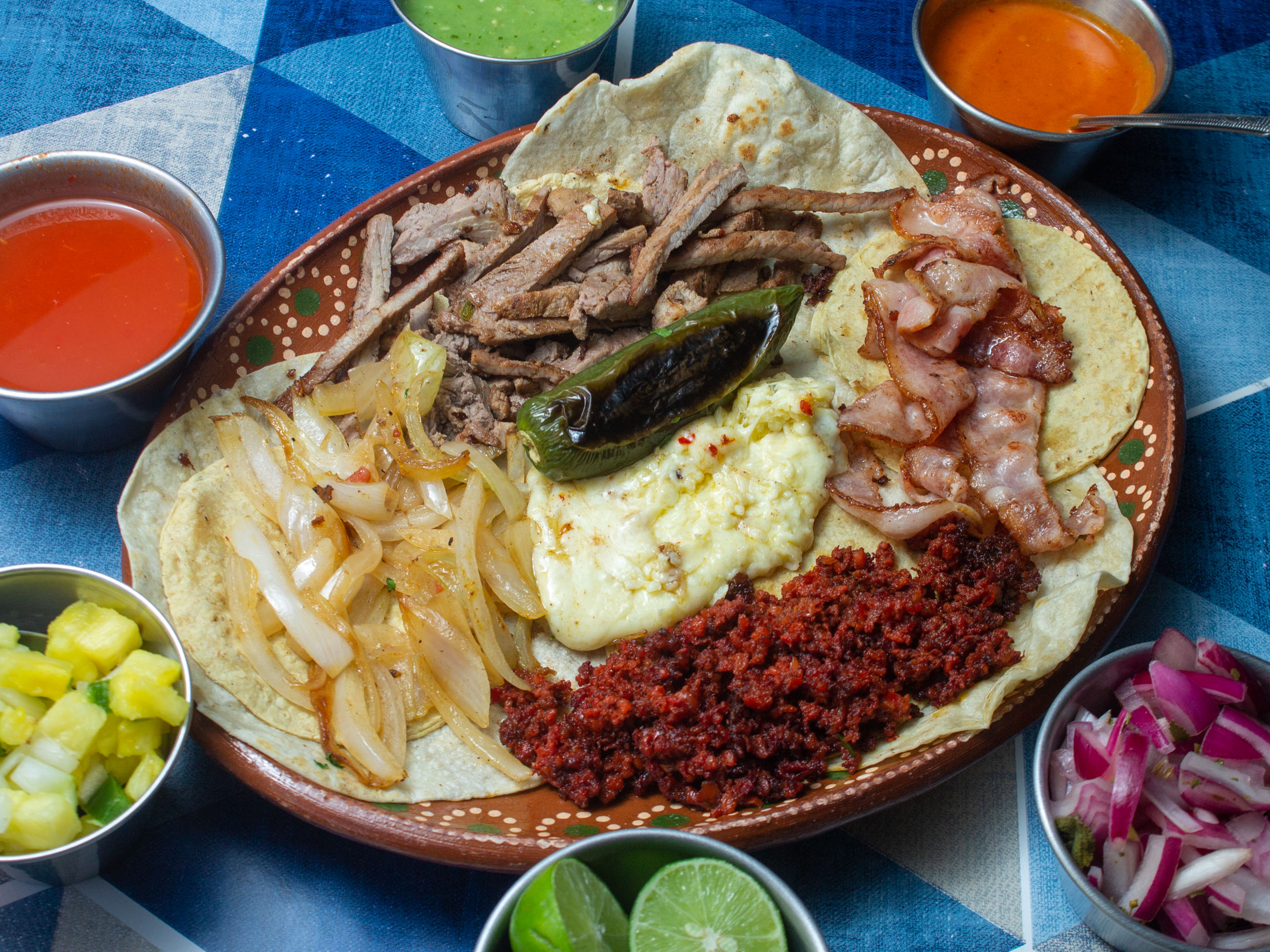 Para taquear: Arrachera, tocino, queso fundido, chorizo, cebollita.