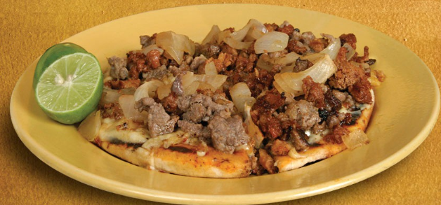Mini pizza con queso asadero, bistec, pastor, chorizo, jamón y cebolla asada.