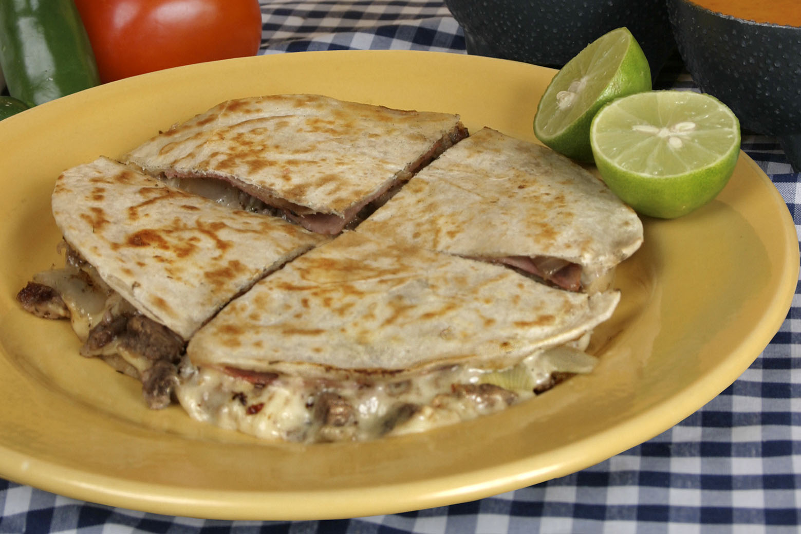 Gringa de bistec de res con queso asadero, jamón y champiñones.
