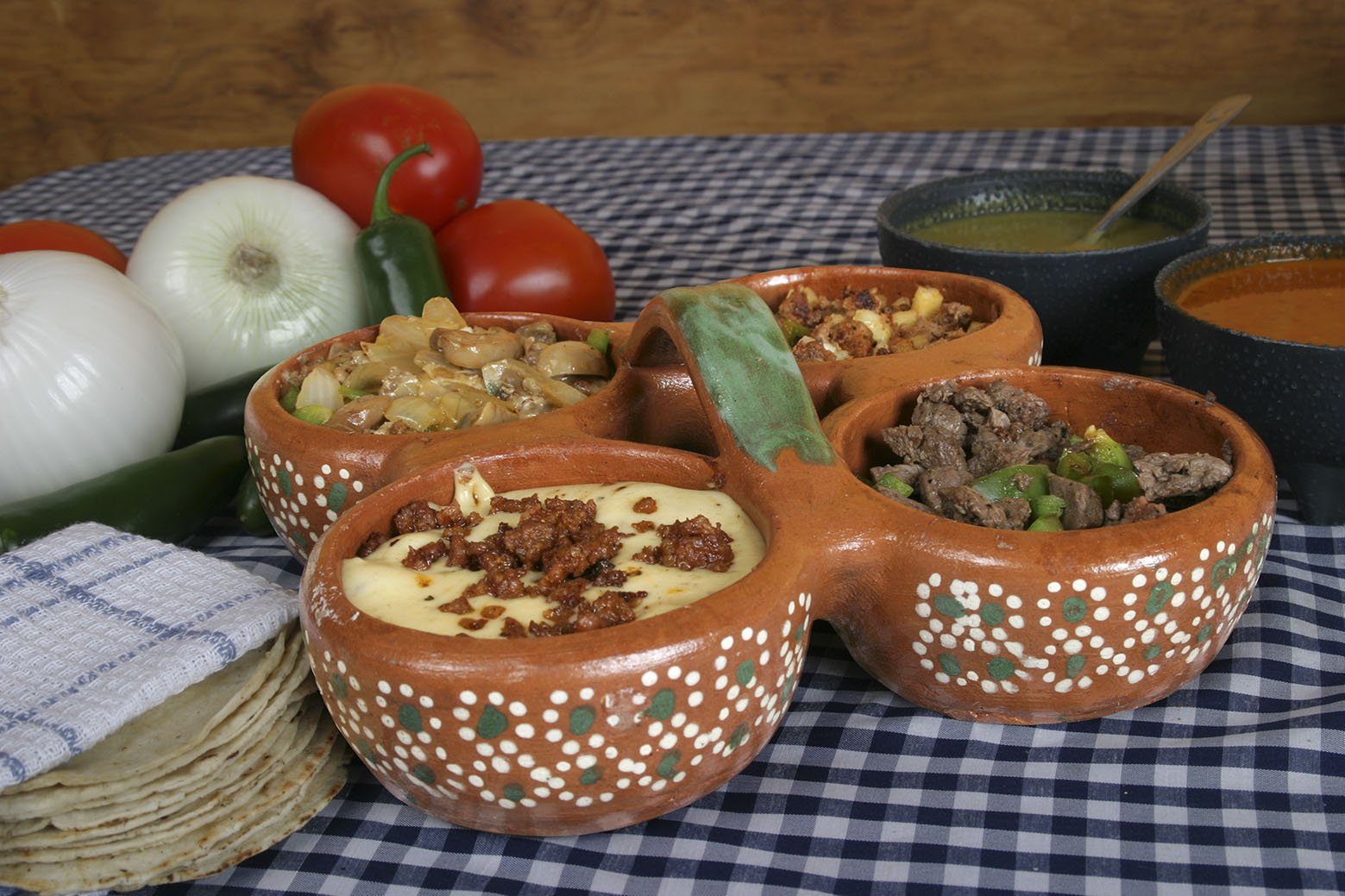 Para taquear, queso asadero combinado con bistec, chorizo, champiñones, pimiento morrón y cebollita.