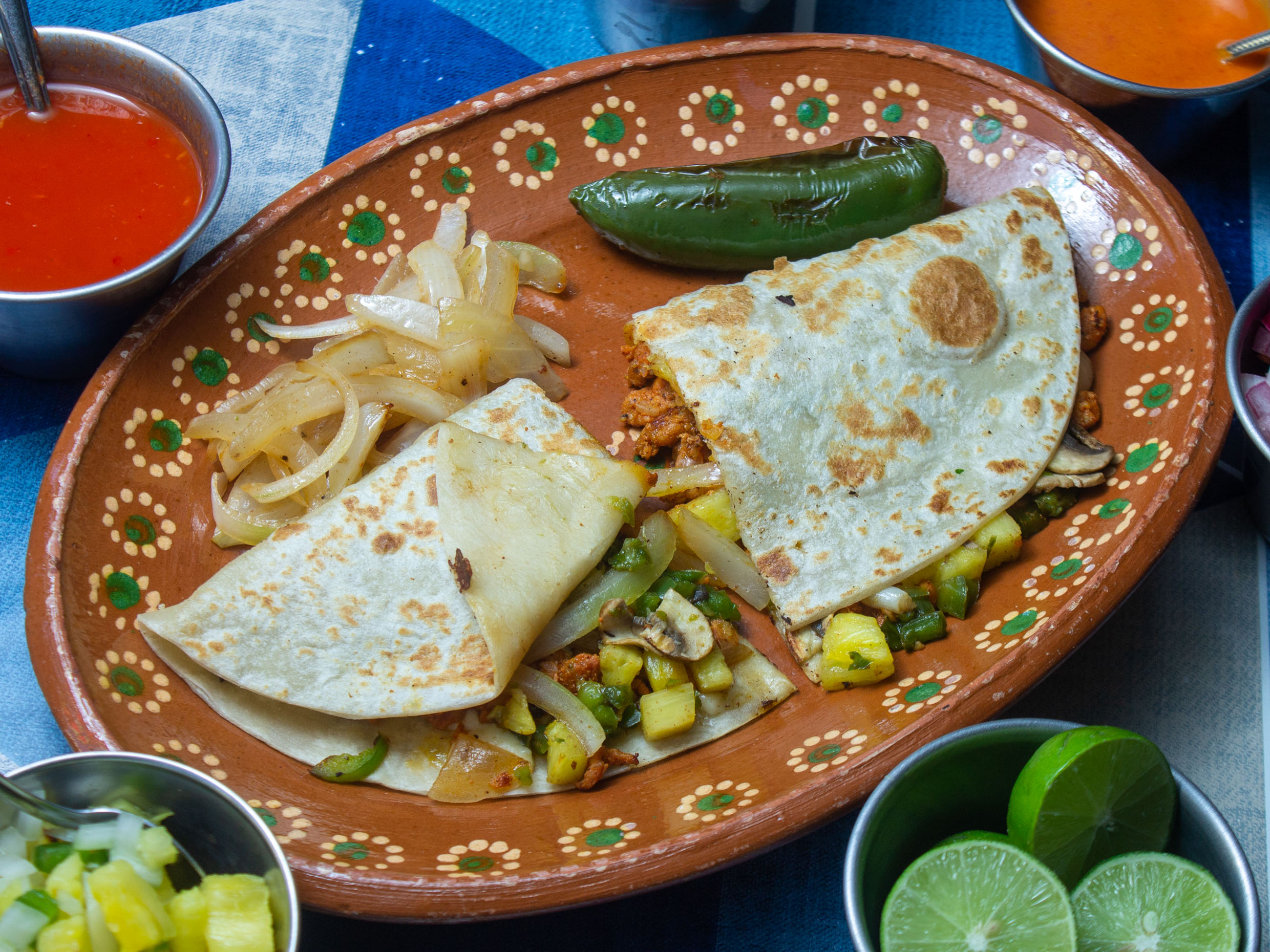 Tortilla de harina gigante con queso asadero, pastor, piña, champiñones, pimiento y cebollita asada.