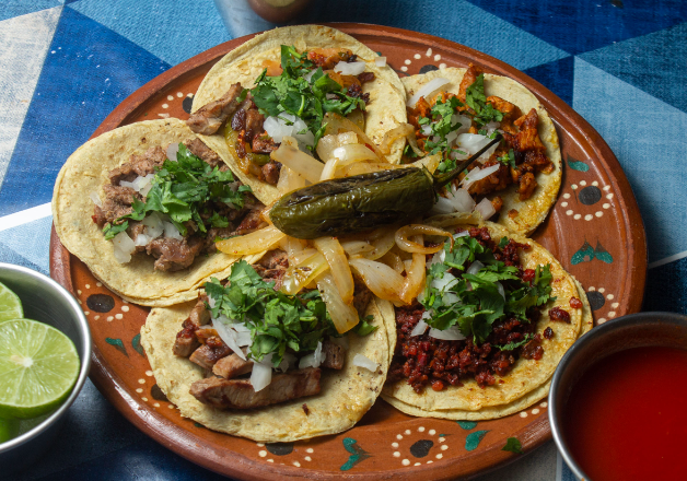 5 Taco Arrachera; hecho con tortilla de maíz, carne de arrachera y sus complementos verdura y salsas.