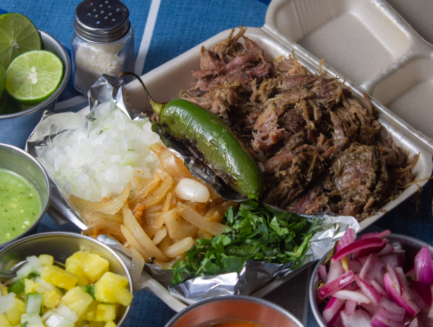 Medio kilo de carne preparada, salsas, verdura, tortillas de harina, maíz, chiles, cebollas asadas