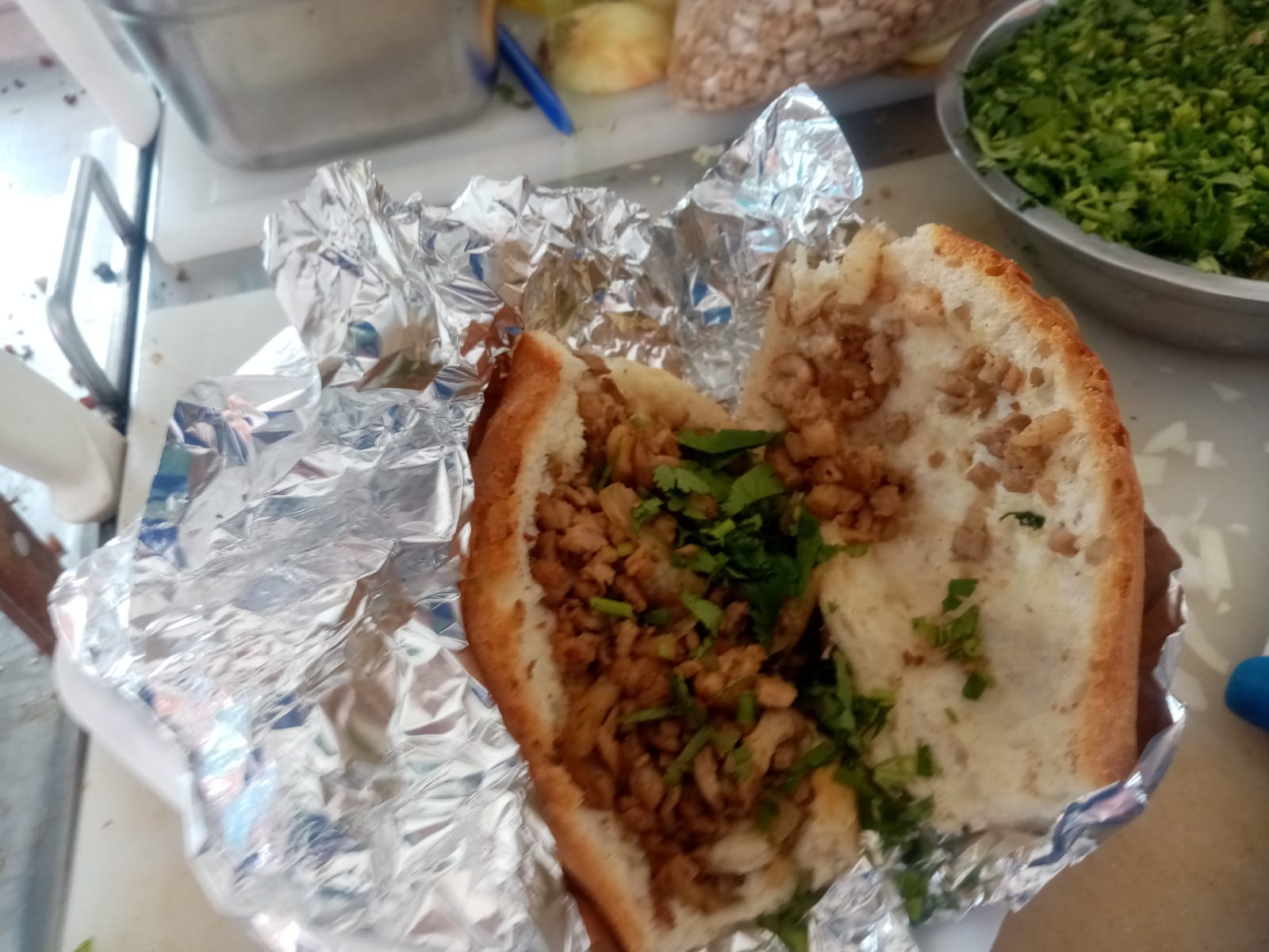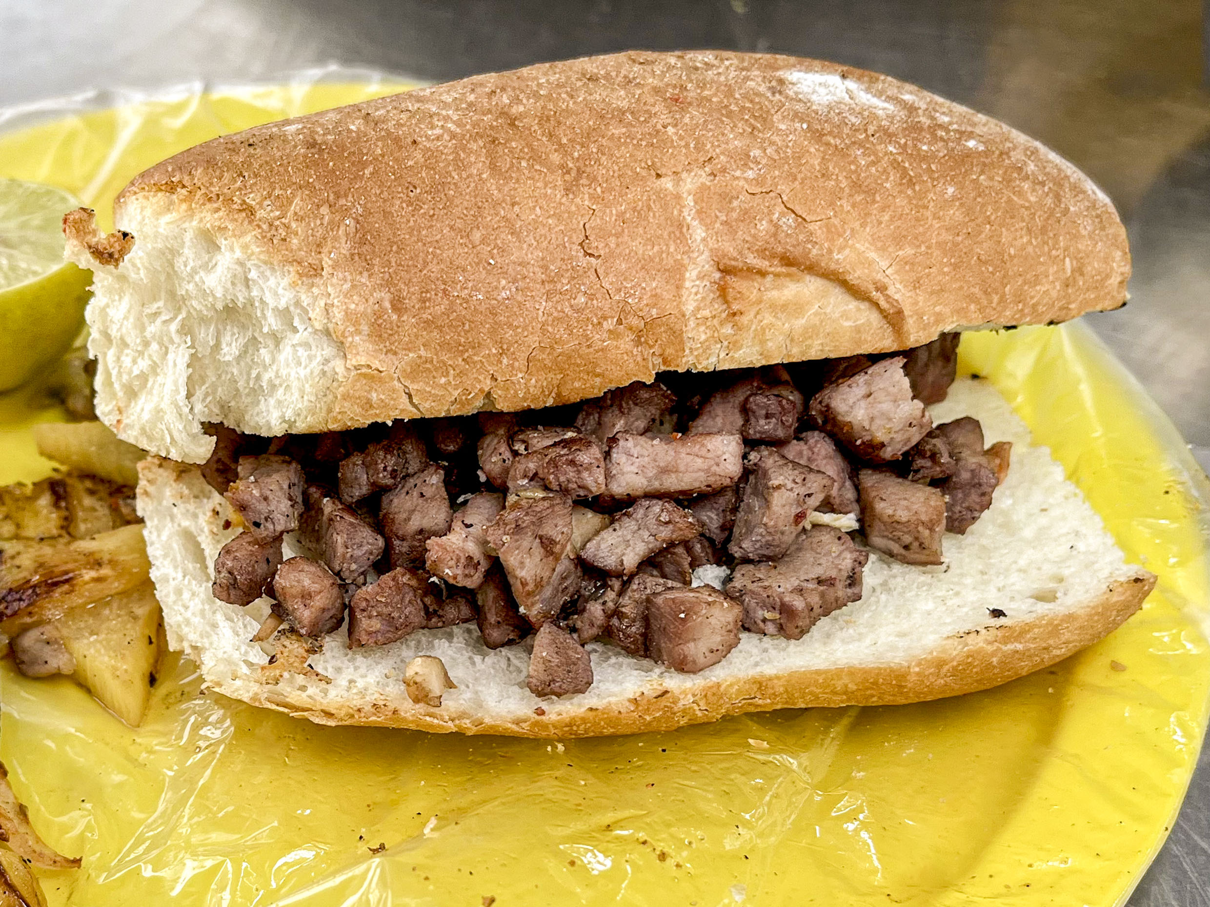 Bolillo de pan con carne, incluye verdura, limón y una de nuestras exquisitas salsas a tu elección.