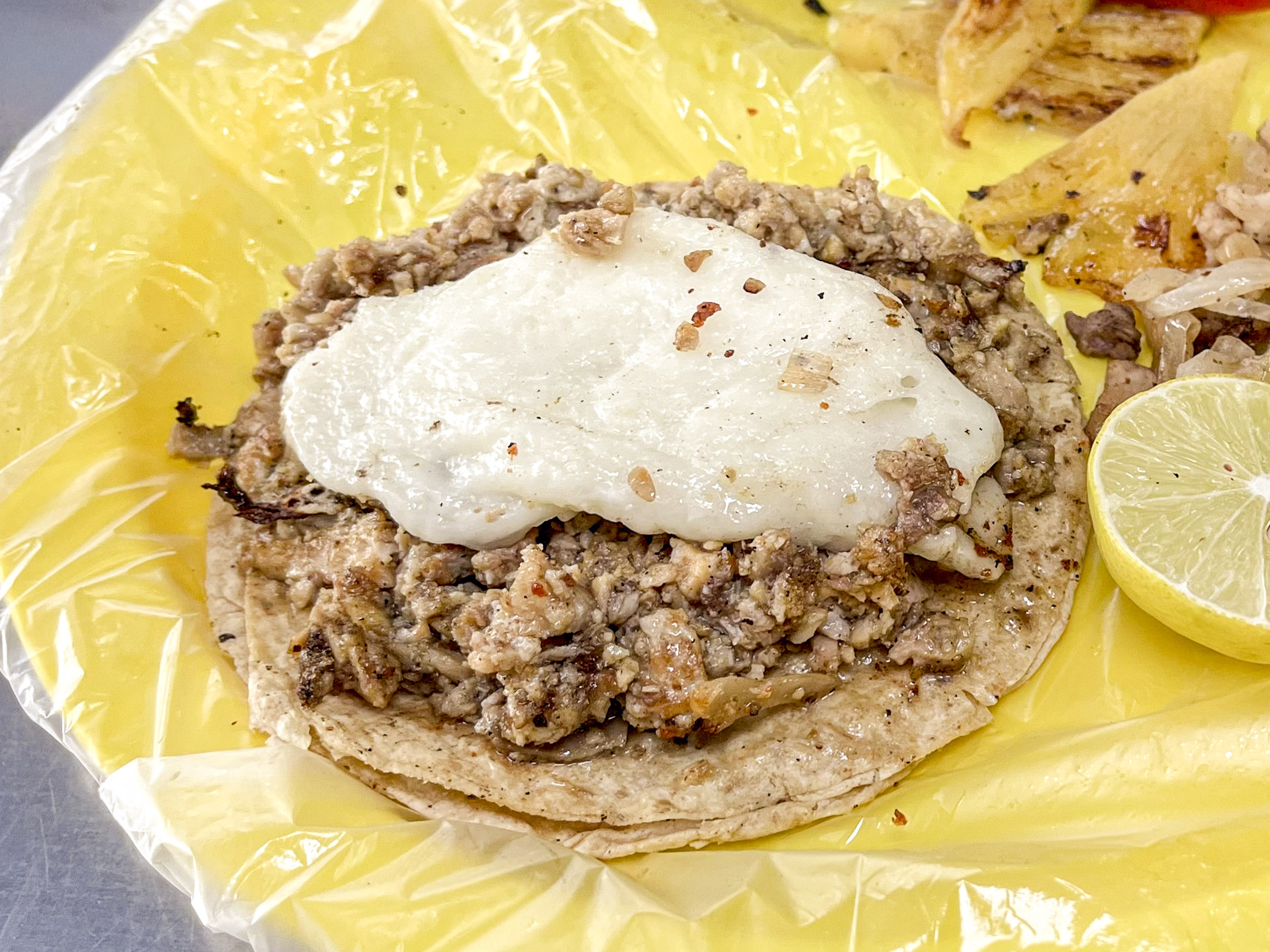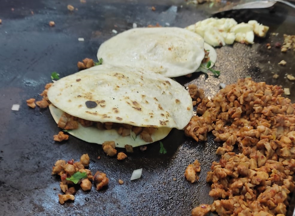 Tortilla de maíz con carne y queso, incluye verdura, limón y una de nuestras exquisitas salsas a tu elección.