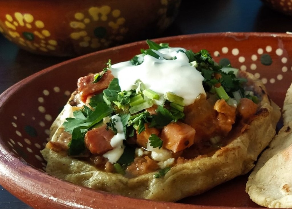 Delicioso sope relleno de frijoles, crema, queso, cilantro, cebolla, incluye salsa.